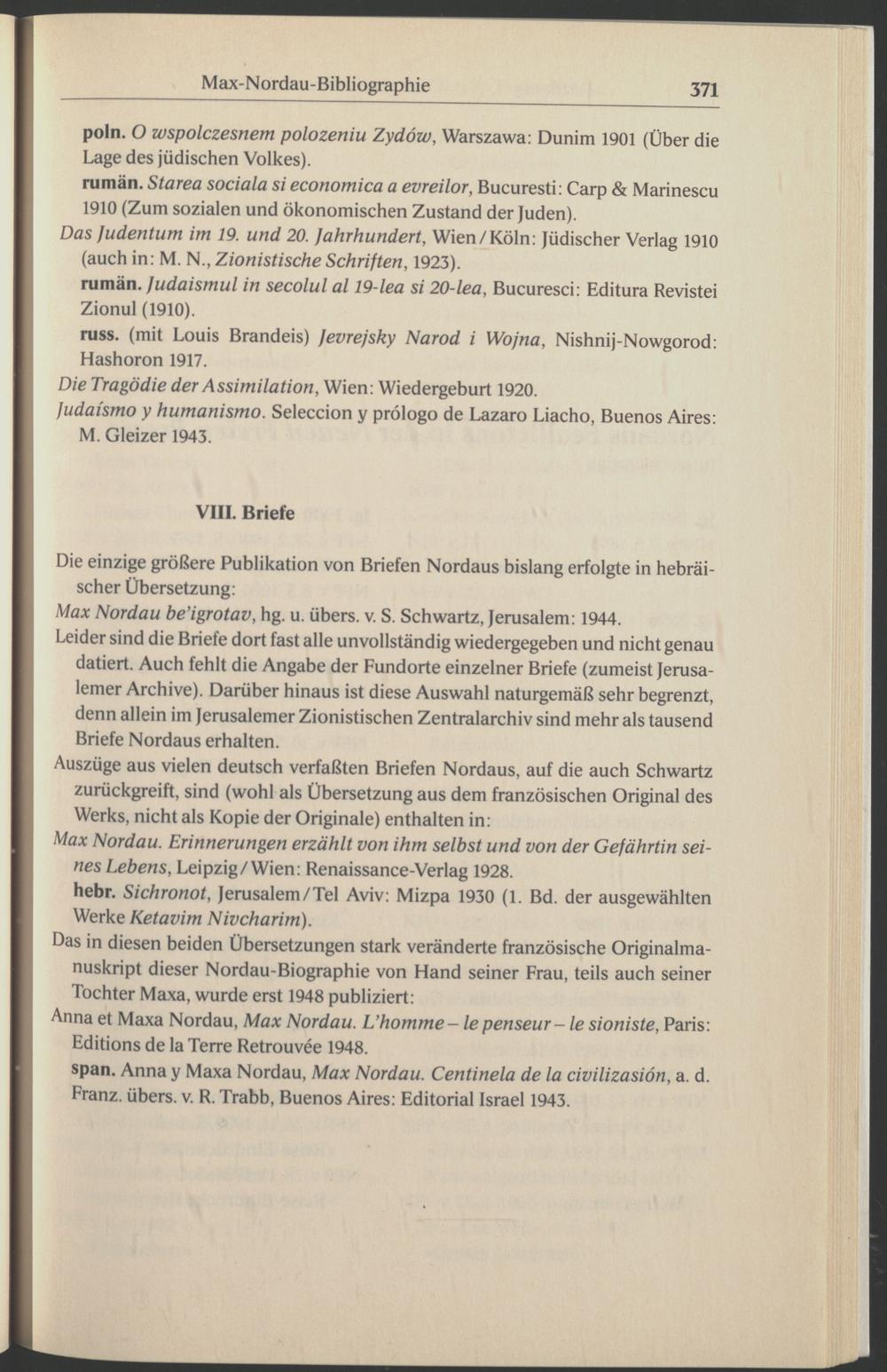 Leider sind die Briefe dort fast alle unvollständig wiedergegeben und nicht genau datiert. Auch fehlt die Angabe der Fundorte einzelner Briefe (zumeist Jerusa lemer Archive). Darüber hinaus ist diese Auswahl naturgemäß sehr begrenzt, denn allein im Jerusalemer Zionistischen Zentralarchiv sind mehr als tausend Briefe Nordaus erhalten.