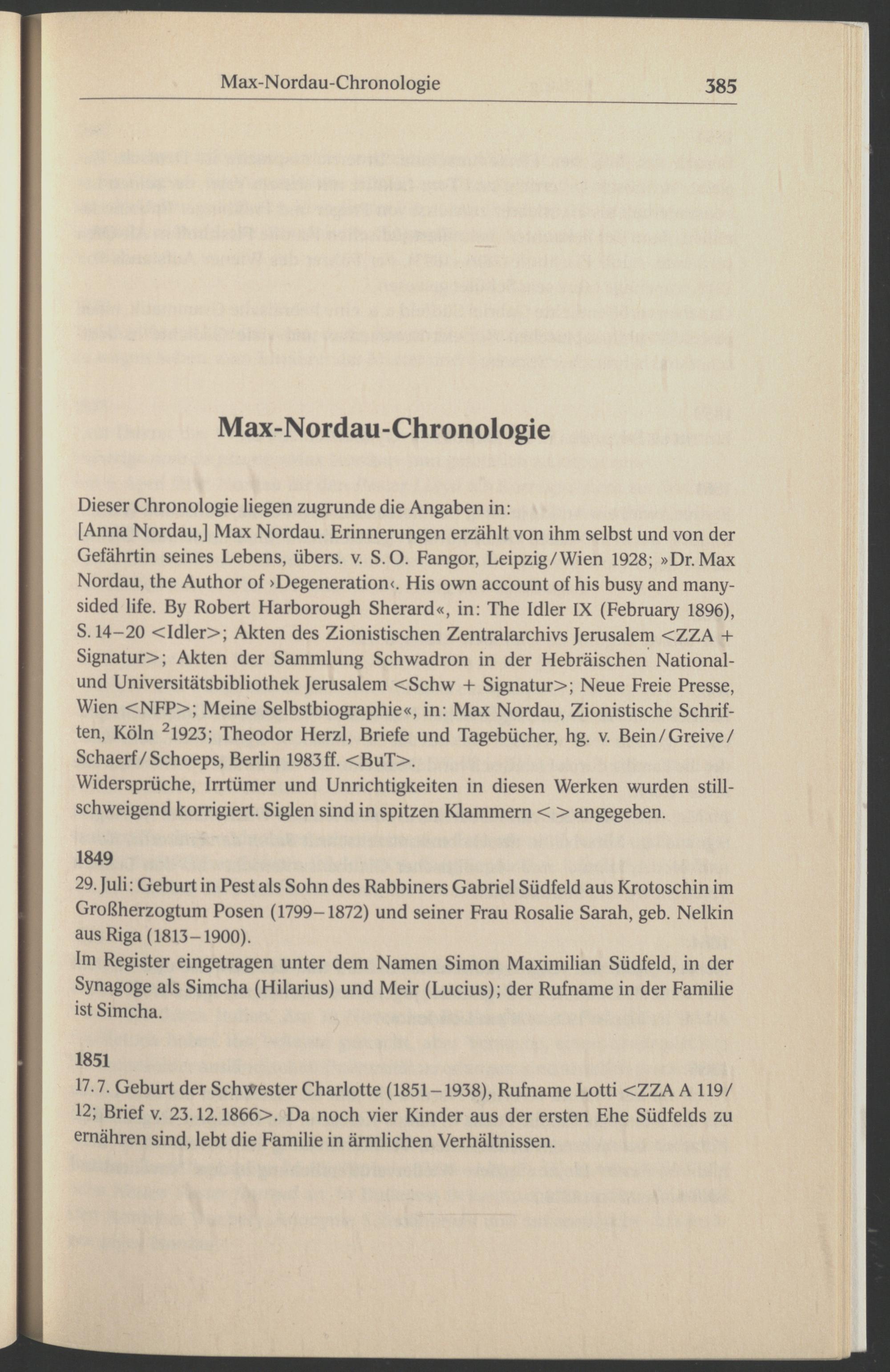 [Anna Nordau,] Max Nordau . Erinnerungen erzählt von ihm selbst und von der Gefährtin seines Lebens, übers, v. S.O. Fangor, Leipzig/Wien 1928; »Dr. Max Nordau, the Author of >Degeneration<. His own account of his busy and many- sided life. By Robert Harborough Sherard «, in: The Idler IX (February 1896), S. 14-20 <Idler>; Akten des Zionistischen Zentralarchivs Jerusalem <ZZA + Signatur>; Akten der Sammlung Schwadron in der Hebräischen National- und Universitätsbibliothek Jerusalem <Schw + Signatur>; Neue Freie Presse, Wien <NFP>; Meine Selbstbiographie«, in: Max Nordau , Zionistische Schriften, Köln 2 1923; Theodor Herzl , Briefe und Tagebücher, hg. v. Bein/Greive/ Schaerf/Schoeps, Berlin 1983 ff. <BuT>.