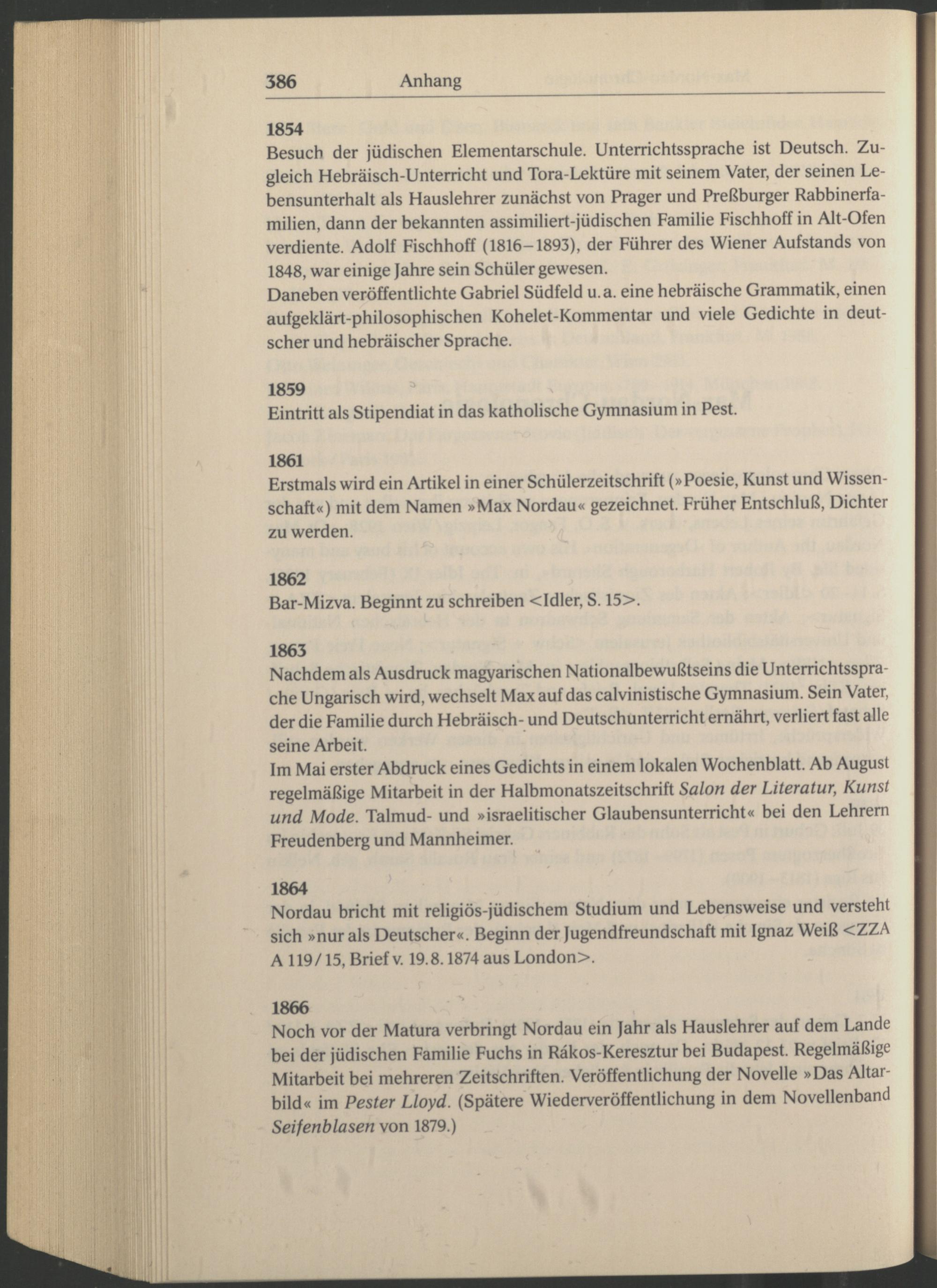 Nordau bricht mit religiös-jüdischem Studium und Lebensweise und versteht sich »nur als Deutscher «. Beginn der Jugendfreundschaft mit Ignaz Weiß <ZZA A 119/15, Brief v. 19.8.1874 aus London >.