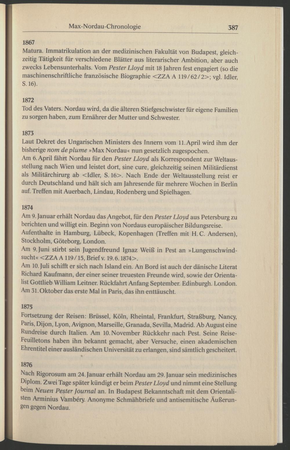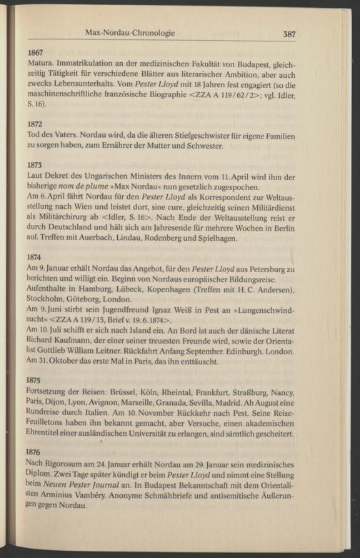 Nach Rigorosum am 24. Januar erhält Nordau am 29. Januar sein medizinisches Diplom. Zwei Tage später kündigt er beim Pester Lloyd und nimmt eine Stellung beim Neuen Pester Journal an. In Budapest Bekanntschaft mit dem Orientalisten Arminius Vambery . Anonyme Schmähbriefe und antisemitische Äußerungen gegen Nordau .