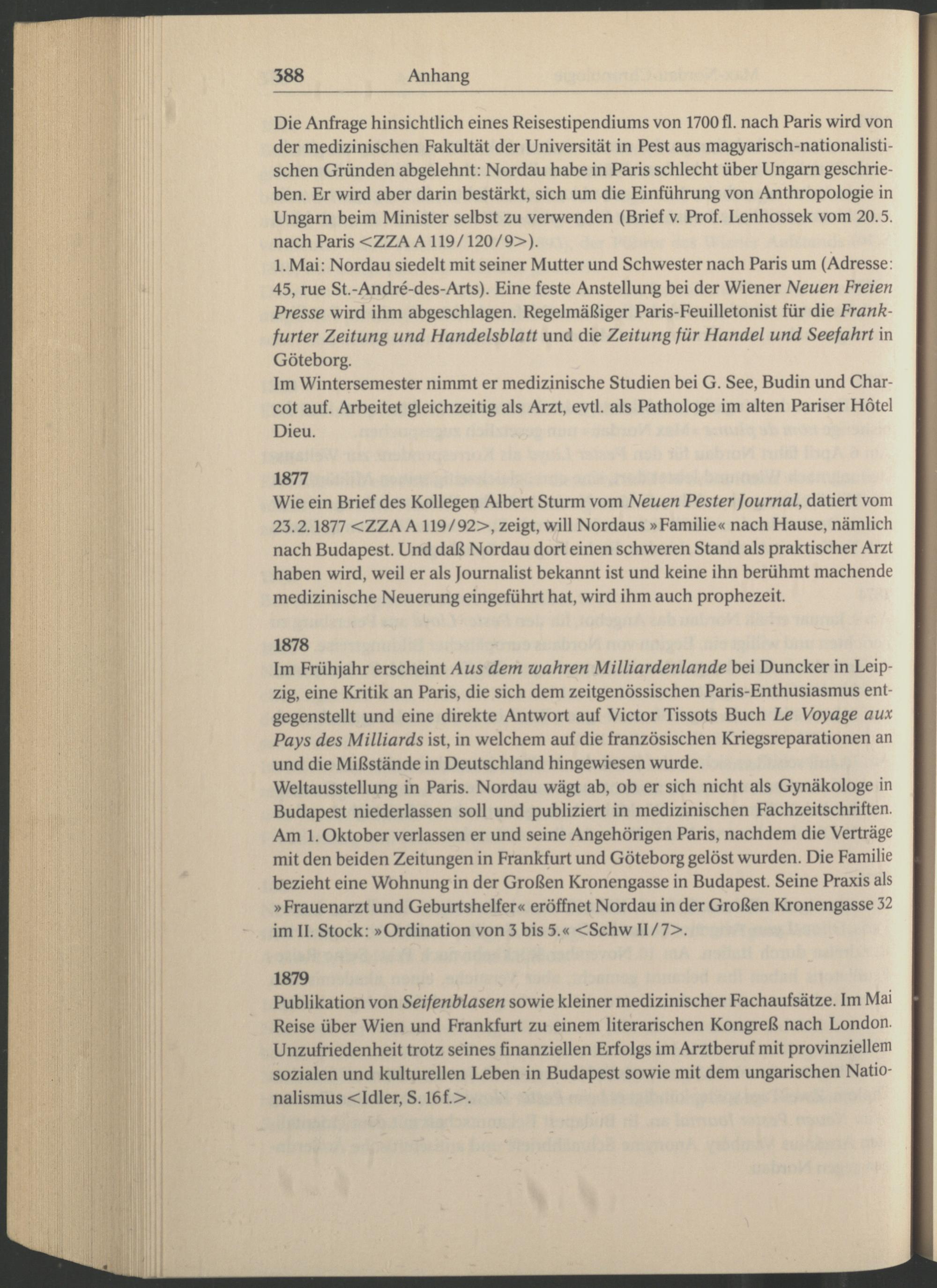 Wie ein Brief des Kollegen Albert Sturm vom Neuen Pester fournal, datiert vom 23.2.1877 <ZZA A 119/92>, zeigt, will Nordaus »Familie« nach Hause, nämlich nach Budapest . Und daß Nordau dort einen schweren Stand als praktischer Arzt haben wird, weil er als Journalist bekannt ist und keine ihn berühmt machende medizinische Neuerung eingeführt hat, wird ihm auch prophezeit.