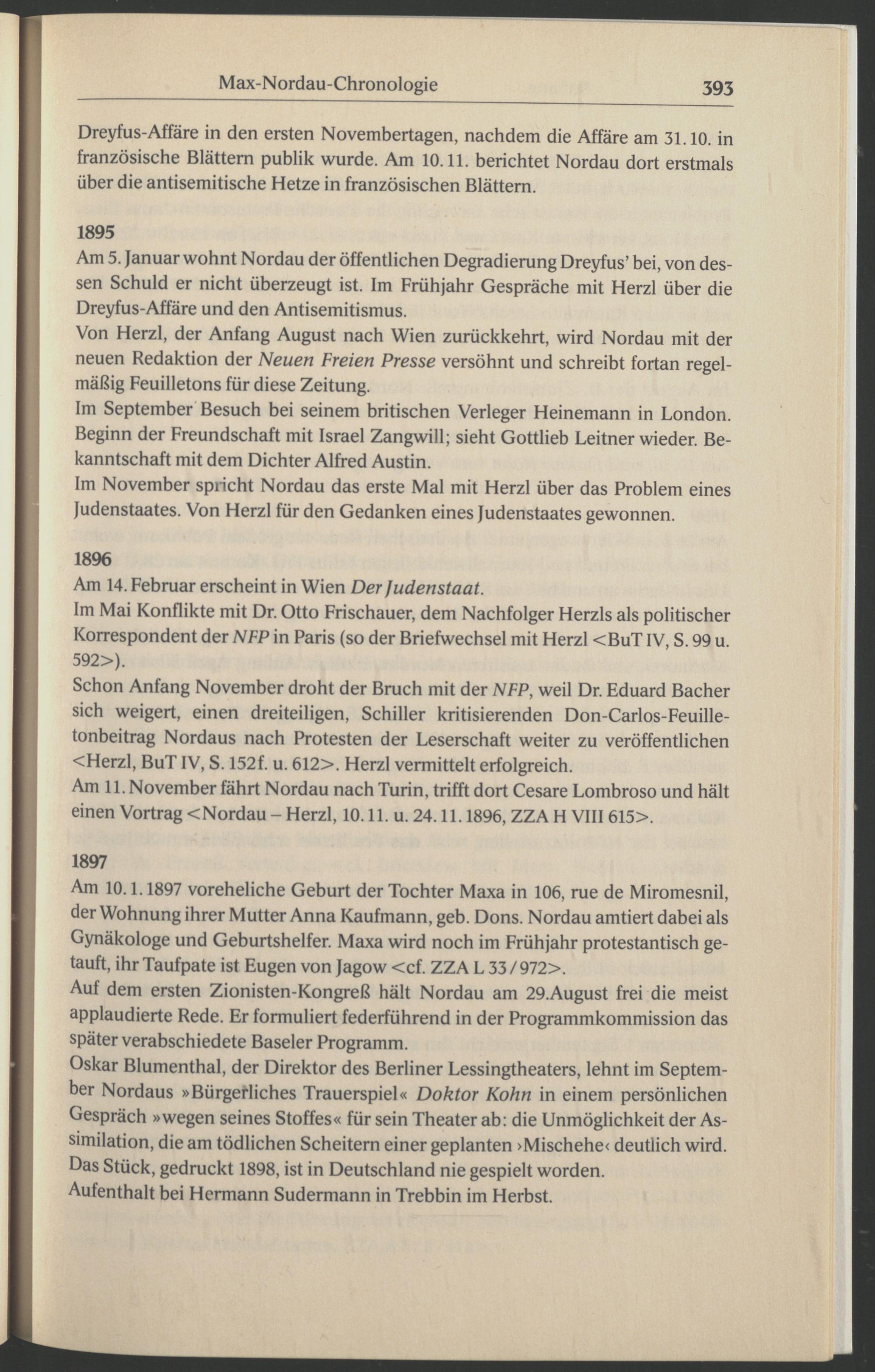 Dreyfus-Affäre in den ersten Novembertagen, nachdem die Affäre am 31.10. in französische Blättern publik wurde. Am 10.11. berichtet Nordau dort erstmals über die antisemitische Hetze in französischen Blättern.