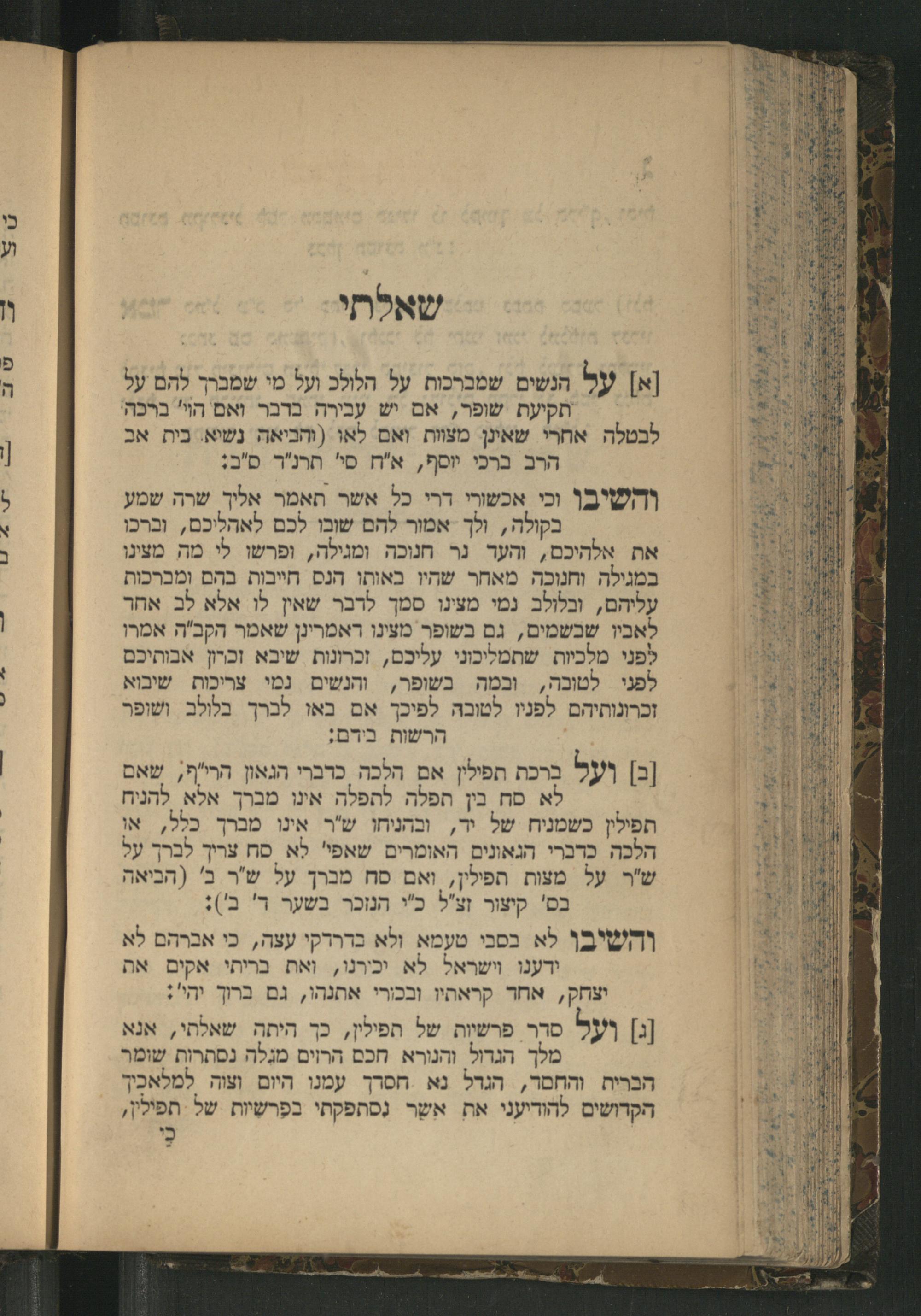 [ב] ועל ברכת תפילין אם הלכה כרברי הגאון הרי"ף, שאם לא סח בין חפלה לתפלה אינו מברך אלא להניח תפילין כשמניח של יר, ובהניחו ש"ר אינו מברך כבלל, או הלכה כרברי הגאונים האומרים שאפ" לא סח צריך לברך על ש"ר על מצות תפילין, ואם סח מברך על ש"ר ב'(הביאה בס' קיצור זצ"ל כ"י הנזכר בשער ר' ב'): והשיבן לא בסבי טעמא ולא בדרדקי עצה, כי אברהם לא ידענו וישראל לא יכירנו, ואת בריתי אקים את יצחק, אחר קראתיו ובכורי אתנהו, גם ברוך יהי"