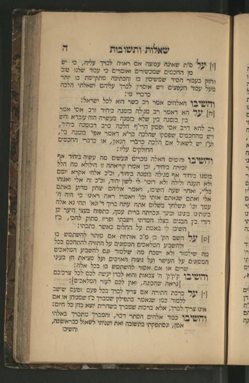 0 על סית שאינה עפצה אם ראיה לברך עליה, כי יש מן החכמים שמכשירים. ואומרים כי עבוד שלנו טוב וחק בעמור הסיד שמשימין בו והכתיכה מתקיימת בו יתר מעל עבור העפצים ויש אוסרין. לברך עליהם ושאלתי הלכה כרברי מי: והשיבו האלהים אמר רב כשר הוא לכל ישראל: [ח] על הא ראמר רב מגילה בזמנה ביחיר. ורב אסי אמר בין בזמנה בין שלא בזמנה בעשרה הוה עוברא וחש רב להא דרב אסי ופסק הר"ף הלכה כרב רבזמנה ביחי, ויש מהחכמים שפסקו שהלכה כר'א ראמר אפ" במנה בי, וע"ן יש לשאול אם הלכה כרברי הגאן, או כרברי. התכמים החולקים עליו: והשיבו והימים האלה נזכרים תעשים מה עשיה ביחיד את זכירה. ביחיד,. וכן אמרו קריאתה זו היולא. מה הלל בזמנו ביחיד אף מגילה. בזמנה ביחיר, וכ"כ אלהי אקרא יומם ולא הענה ולילה ולא רומי" לי לשון יחיר, וכ"כ זה אלי ואנוהו בל'י, ואחר שעה השיבו, ויאמר אליהם יצחק מרוע באתם אלי ואתם שנאתם אותי וכו' ויאמרו ראה ראינו. בי היה ה עמך וכ' ונשלחך בשלום אתה עתה ברוך ד'ונא' תהי נא אלה בינותינו. בינכו נכרתה ברית עמך, כתפות בעצי היער כ דורי.בין. הבנים. בצלו חמרתי וישבתי ופריו מתוק לחכי, כ" השיבו לי באמת על החלום באשר כתבתי! [ט] על השם הק' בן מ"ב אותיות אם מותר להשתמש בן ולהשביע המלאבים הממונים על התורה להתחכם בכל מה שילמור. ולא ישבח. מה. שילמור וגם להשביע. המלאכים הממונים. על העושר ועל ניצוח האויבים ועל מציאת חן בעיני שרים או אם אפור להשתמש בו בכל אלה: והשיבן ק'ק'ק' ה' צבאות והוא לבדו יעשה לכם לכל צרכיכם [נראה שהכונה, ואין לכם לעזר המלאכים]: [י] על ברכת. התורה. אם צריך לברך בכל פעם ופעם שישב ללמור. כמו שנאמר בתפילין שמברך כ"ז שמניחן או אם אינו צריך לברך, אלא ברכות שמברך בשחרית יוצא בהן כל היום: וחשיבו כמד אלהים הסתר. דבר,. והמברך מתברך באלהי אמן, ונסתפקתי בחשובה זאת ושניתי לשאול כבראשונה,