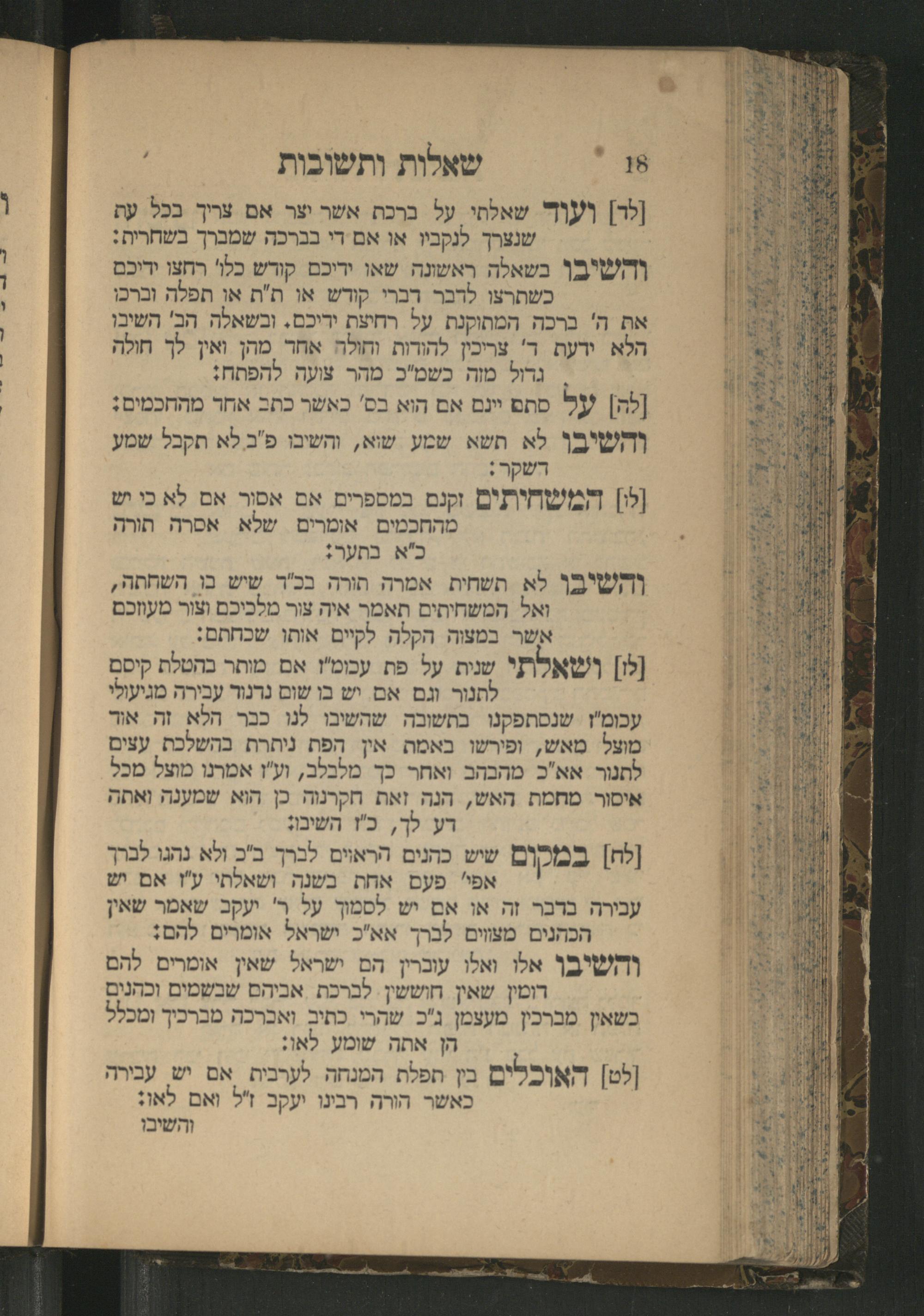 דע לך, כ"ז השיבו: [לת] במקום שיש כהנים הראוים לברך ב"כ ולא נהגו לברך אפי' פעם אחת בשנה ושאלתי ע"ו אם יש עבירה ברבר זה או אם יש לסמוך על ר' יעקב שאמר שאין הכהנים מצווים לברך אא"כ ישראל אומרים להם: והשיבן אלו ואלו עוברין הם ישראל שאין אומרים להם דומין שאין חוששין. לברכת אביהם שבשמים וכהנים בשאין מברכין מעצמן ג"כ שהרי כתיב ואברכה מברכיך ומכלל , הן אתה שומע לאו: [לט] האוכלים בן תפלת המנחה לערבית אם יש עבירה כאשר הורה רבינו יעקב ז"ל ואם לאוז