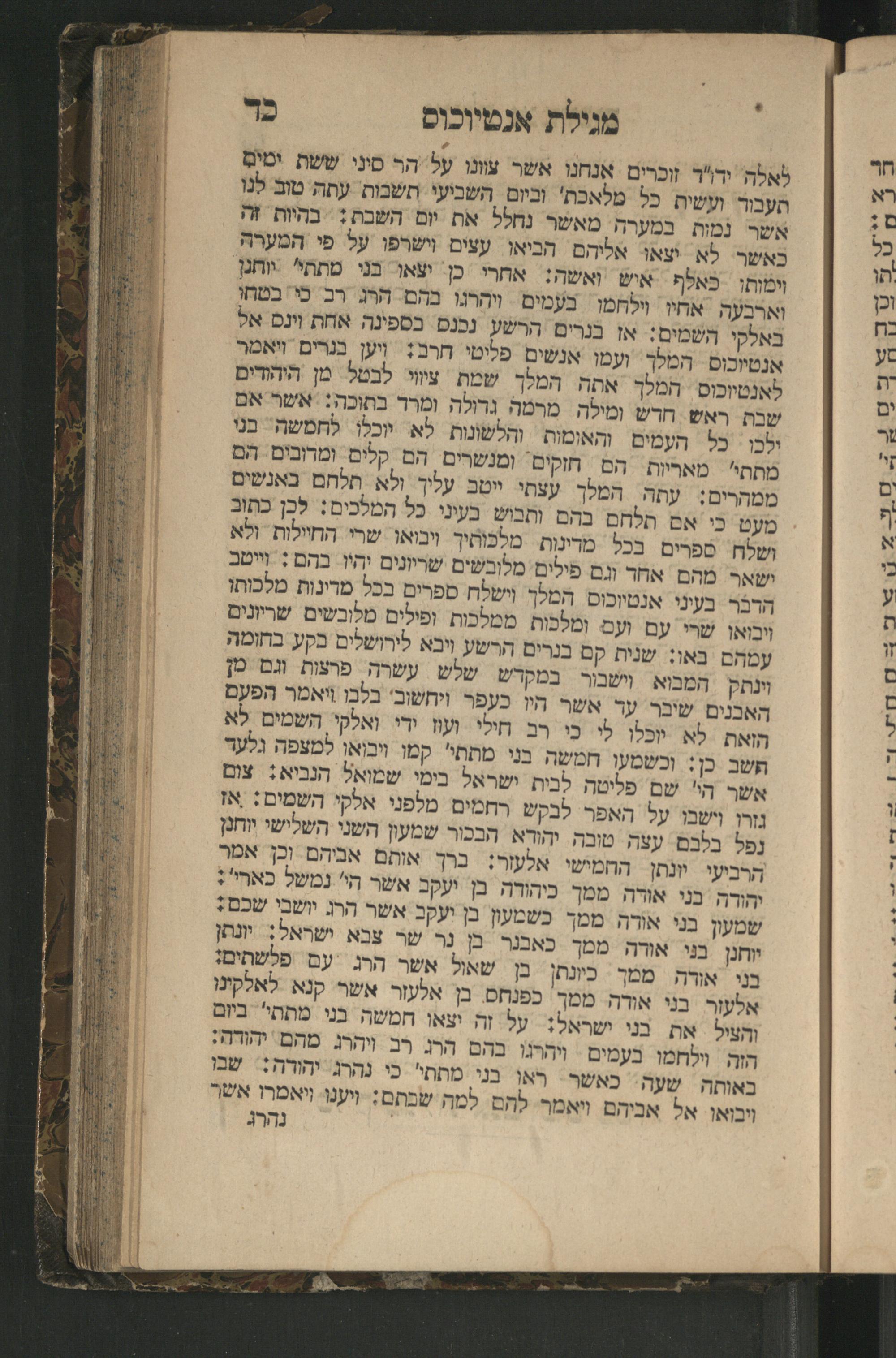 לאלה וה"ד זוכרים. אנחנו אשר צונו על הר סינ ששת ימים העבור ועשית כל מלאכת' וביום השביעי חשבות עתה מוב לנו אש- נמות במערה מאשר נחלל את יום השבת: בהיות זה כאשר לא יצאו אליהם הביאו עצים וישרפו על פי המערה וימותו כאלף איש ואשה: אחרי כן יצאו בני מתתי" יותנן וארבעה אחיו וילחמו בעמים ווהרגו, בהם. הרג רב כי בטחו באלקי השמים: אז בנרים הרשע נכנם בספינה אחת וינם אל אנטייכוס. המלך. ועמו אנשים פליטי חרב? ויק בנרים ויאמ לאנטיוכום המלך אתה המלך שמת ציוי לבטל מן היהדים שבת ראש חדש ומילה מרמה גדולה ומרר בתוכה: אשר אם ילכו כל העמים והאומות והלשונות לא יכלו לחמשה. בנו מתתי" מאריות הם חזקים" ומנשרים הם קלים ומדובים. הם ממהרים: עתה המלך עצתי ייטב עליך ולא תלחם באנשים מעט כי אם תלחם בהם ותבש בעיני. כל המלבים: לכן כתוב ושלח. ספרים בכל מרינות. מלכותיך ויבואו. שרי החיילות ולא ושאר מהם אחד וגם פילים מלובשים שריונים יהיו בהם: ו"טב הדבר. בעיני. אנטיוכוס המלך וישלח ספרים בכל מרינות מלכותו ויבאו שרי עם ועם ומלכות ממלכות ופילים מלובשים שריונים עמהם באו: שנית קם בנרים הרשע ויבא לירושלים בקע בחומה וינתק הממא. וישבור במקרש שלש עשרה פרצות וגם כ] האבנים שיבר עד אשר היו כעפר ויחשוב' בלבו ויאמר הפעם הואת לא יכלו לי כי רב חולי. וע ידי ואלקי השמים לא חשב כן: וכשמעו חמשה בני מתת" קמו ויבואו למצפה גלעד אשר הי" שם פליטה. לבות ישראל בימי שמואל הנביא: צום גזרו וישבו על האפר לבקש רחמים מלפני אלקי השמים: אז נפל בלבם עצה מובה יהורא הבכור שמעון השני השלישי יוחנן הרביעי. יונתן החמישי אלעזר: ברך אותם אביהם וכן אפר יהודה בני אודה ממך ביהורה. בן יעקב אשר הי" נמשל כארי"? שמעון בנו אורה ממך כשמעון בן יעקב אשר הרג יושבי שכם? ווחנן. בני אורה ממך כאבנר. בן נר שר צבא ישראל: ית בני אורה ממך כיונתן בן שאול אשר הרג\עם פלשתים: אלעזר בני אורה ממך כפנחס. בן אלעזר. אשר קנא לאלקינו והציל את בנ ושראל: על זה יצאו חמשה בני מתת" ביום הזה ולחמו. בעמים- ויהרגו. בהם הרג רב ויהת מהם יהודה: באותה שעה כאשר. ראו בני מתתי" כי. נהרג. יהורה: שבו ויבואו אל אביהם ויאמר. להם למה שבתם: וענו ויאמרו אשר נהרג