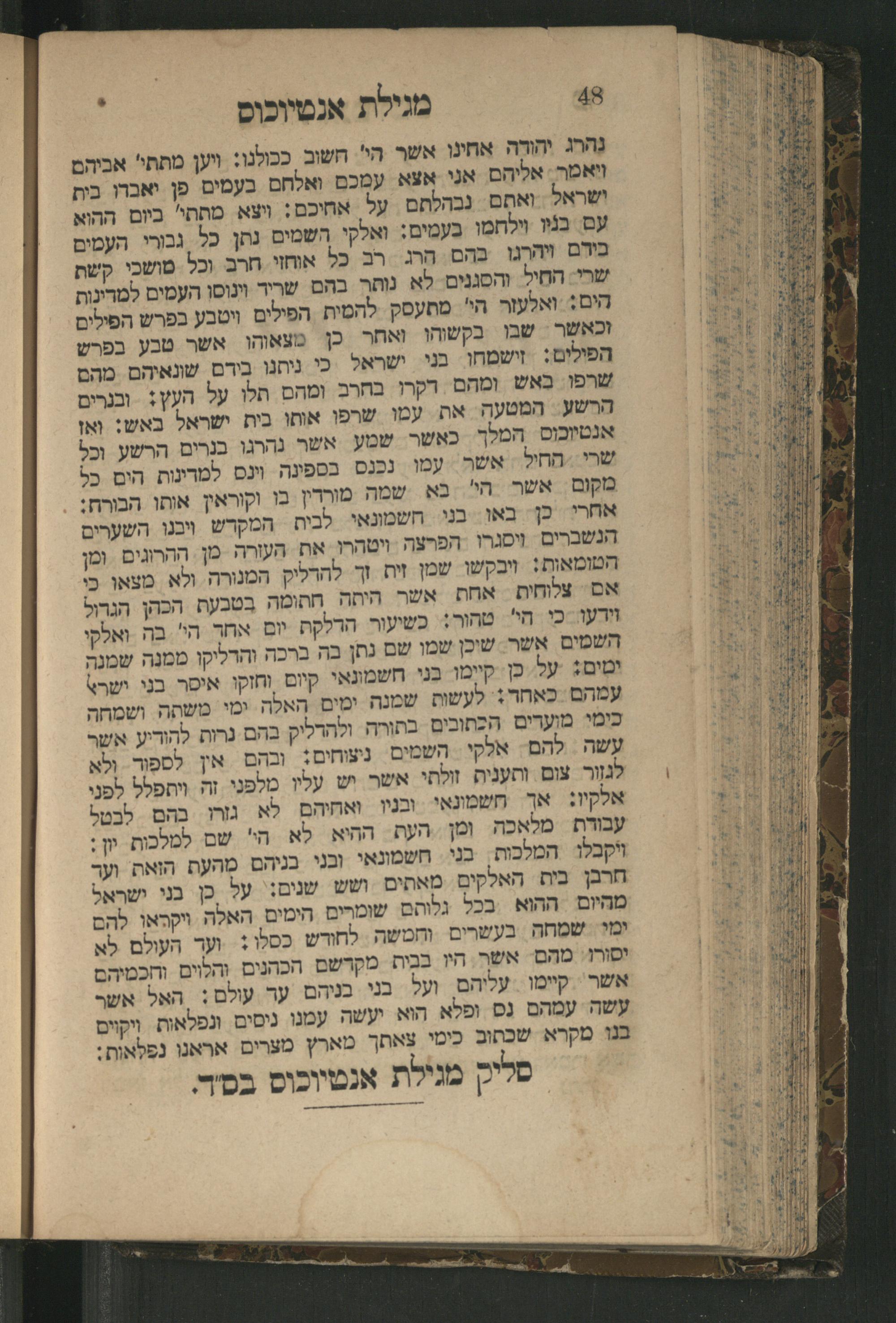 נהרג יהודה אחינו אשר הי" חשוב ככולנו: ויען מתתי" אביהם ויאמר. אליהם. אני אצא עמכם ואלחם בעמים פן יאבדו בית ישראל ואתם נבהלתם על, אחיכם: וצא. מתתי' ביום. ההיא עם בניו וילחמו בעמים: ואלקי השמים נתן כל גבורי. העמים בירם ויהרגו בהם הרג רב כל אוחזי חרב וכל מושכי קשת שרי החיל והסגנים לא נותך בהם שריר וינוסו העמים למרינות הים: ואלעזר ה" מתעסק להמית הפילים ויטבע בפרש הפילים וכאשר שבו בקשהו ואתר כן מצאהו אשר טבע בפרש הפילים: זישמחו. בני. ישראל כי ניתנו בירם. שנאיהם. מהם שרפו באש ומהם רקרו בחרב ומהם תלו על העץ: ובנרים הרשע המטעה את עמו שרפו אותו בית ישראל באש:|אז אנטיוכוס המלך כאשר שמע אשר נהרגו בנרים הרשע וכל שרי החיל אשר עמו נכנם בספינה וינם למרינות הים כל מקום אשר ה" בא שמה מוררין בו וקוראין אותו הבורת: אחרי כן= באו בני. חשמונאי. לבית המקרש ויכנו השערים הנשברים ויסגרו הפרצה ויטהרו, את העורה מן. ההרוגים. ומן המומאות: ויבקשו שמן זית וך להרליק המנורה ולא מצאו כי אם. צלוחית אחת אשר היתה חתומה בטבעת הכהן הגרול זירעו-כי ה" טהור+ כשיעור הרלקת יום אחד ה" בה ואלקי השמים אשר. שיכן שמו שם נתן בה ברכה והרליקו ממנה שמנת ימים: על כן קיימו בני חשמונאי קיום וחזקו איסר בני ושר\ עמהם כאחר: לעשות שמנה ימים האלה ימי משתה ושמחה כימי מוערים. הכתובים בתורה ולהרליק בהם נרות להוריע אשר עשה להם. אלקי השמים. ניצוחים: ובהם אין לספוד. ולא לגזור צום ותעניה זולתי אשר יש עליו מלפני זה ויתפלל לפני אלקיו: אך תשמנאי בניו ואחיהם לא גזו בהם לבטל עבורת מלאכה ומן העת ההיא לא ה" שם למלכות ין: ויקבלו המלכות, בני. חשמונאי ובני בניהם מהעת הואת וער חרבן בית. האלקים מאתים ושש שנים: על כן בני ישראל מהיום ההוא בכל גלוהם שומרים הימים. האלה וראו להם מיי שמחה בעשרים וחמשה לחודש כסלו: וער העולם לא מהם אשר היו בבית. מקדשם הכהנים והלוים והכמיהם אשר קיימו.עליהם ועל בני בניהם ער עלם: האל אשר עשה עמהם נם ופלא הוא יעשה עמנו ניסים. ונפלאות. ויקוים בנו מקרא שכתוב כימי צאתך מארץ מצרים. אראנו נפלאות: סליק מנילת אנטיוכוס בס'ד.