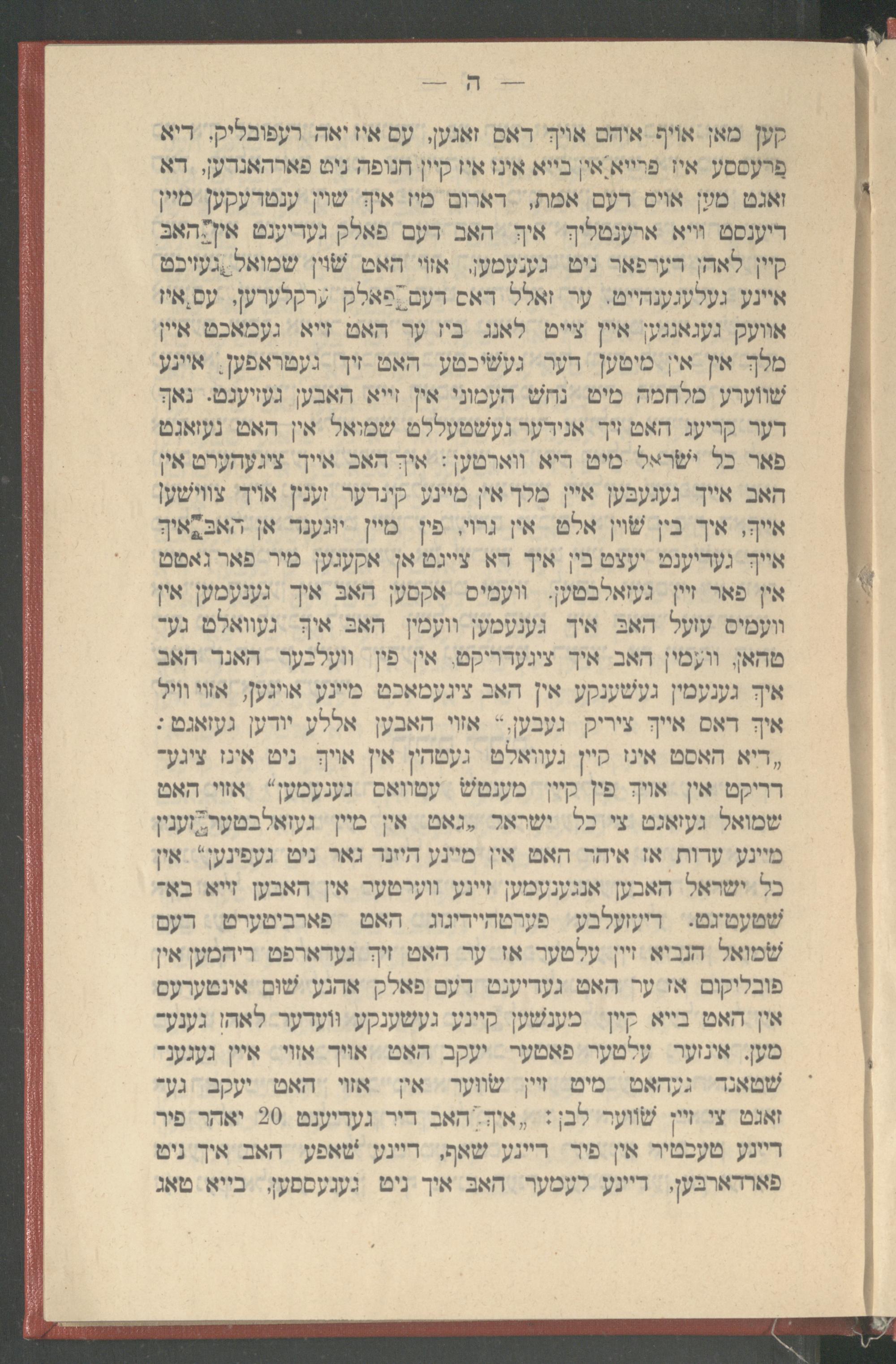 קען מאן אויף איהם אויך דאס זאגען, עס איז יאה רעפובליק. דיא פרעססע איז פרייא אין בייא אינז איז קיין חנופה ניט פארהאנדען, דא זאגט מען אויס דעם אמת, דארום מין איך שוין ענטדעקען מיין דיענסט וויא ארענטליך איך האב דעם פאלק געדיענט אין האב קיין לאהן דערפאר ניט גענעמען, אזוי האט שוין שמואל געזיכט איינע געלעגענהייט. ער זאלל דאס דעם פאלק ערקלערען, עס איז אוועק געגאנגען איין צייט לאנג ביז ער האט זייא געמאכט איין מלך אין אין מיטען דער געשיכטע האט זיך געטראפען, איינע שווערע מלחמה מיט נחש העמוני אין זייא האבען געזענט. נאך דער קריעג האט זיך אנידער געשטעללט שמואל אין האט געזאגט פאר כל ישראל מיט דיא ווארטען: איך האב אייך ציגעהערט אין האב אייך געגעבען איין מלך אין מיינע קינדער זענין אויך צווישען אייך, איך בין שוין אלט אין גרוי, פין מיין יוגענד אן האב איך אייך געדיענט יעצט בין איך דא צייגט אן אקעגען מיר פאר גאטט אין פאר זיין געזאלבטען, וועמיס אקסען האב איך גענעמען אין וועמיס עזעל האב איך גענעמען וועמין האב איך געוואלט גע־ טהאן, וועמין האב איך ציגעדריקט, אין פין וועלכער האנד האב איך גענעמיין געשענקע אין האב ציגעמאכט מיינע אויגען, אזוי וויל איך דאס אייך ציריק געבען, אזוי האבען אללע יודען געזאגט: , דיא האסט אינז קיין געוואלט געטהין אין אויך ניט אינז ציגע־ דריקט אין אויך פין קיין מענטש עטוואס גענעמען אזוי האט שמואל געזאגט צי כל ישראל גאט אין מיין געזאלבטער זענין מיינע עדות אז איהר האט אין מיינע היינד גאר ניט געפינען אין כל ישראל האבען אנגענעמען זיינע ווערטער אין האבען זייא באר שטעטיגט. דיעזעלבע פערטהיידיגוג האט פארביטערט דעם שמואל הנביא זיין עלטער אז ער האט זיך געדארפט ריהמען אין פובליקום אז ער האט געדיענט דעם פאלק אהנע שׁוּם אינטערעס אין האט בייא קיין מענשען קיינע געשענקע וועדער לאהן גענע־ מען, אינזער עלטער פאטער יעקב האט אויך אזוי איין געגעני שטאנד געהאט מיט זיין שווער אין אזוי האט יעקב גע־ זאגט צי זיין שווער לבן: איך האב דיר געדיענט 20 יאהר פיר דיינע טעכטיר אין פיר דיינע שאף, דיינע שאפע האב איך ניט פארדארבּען, דיינע לעמער האב איך ניט געגעססען, בייא טאג