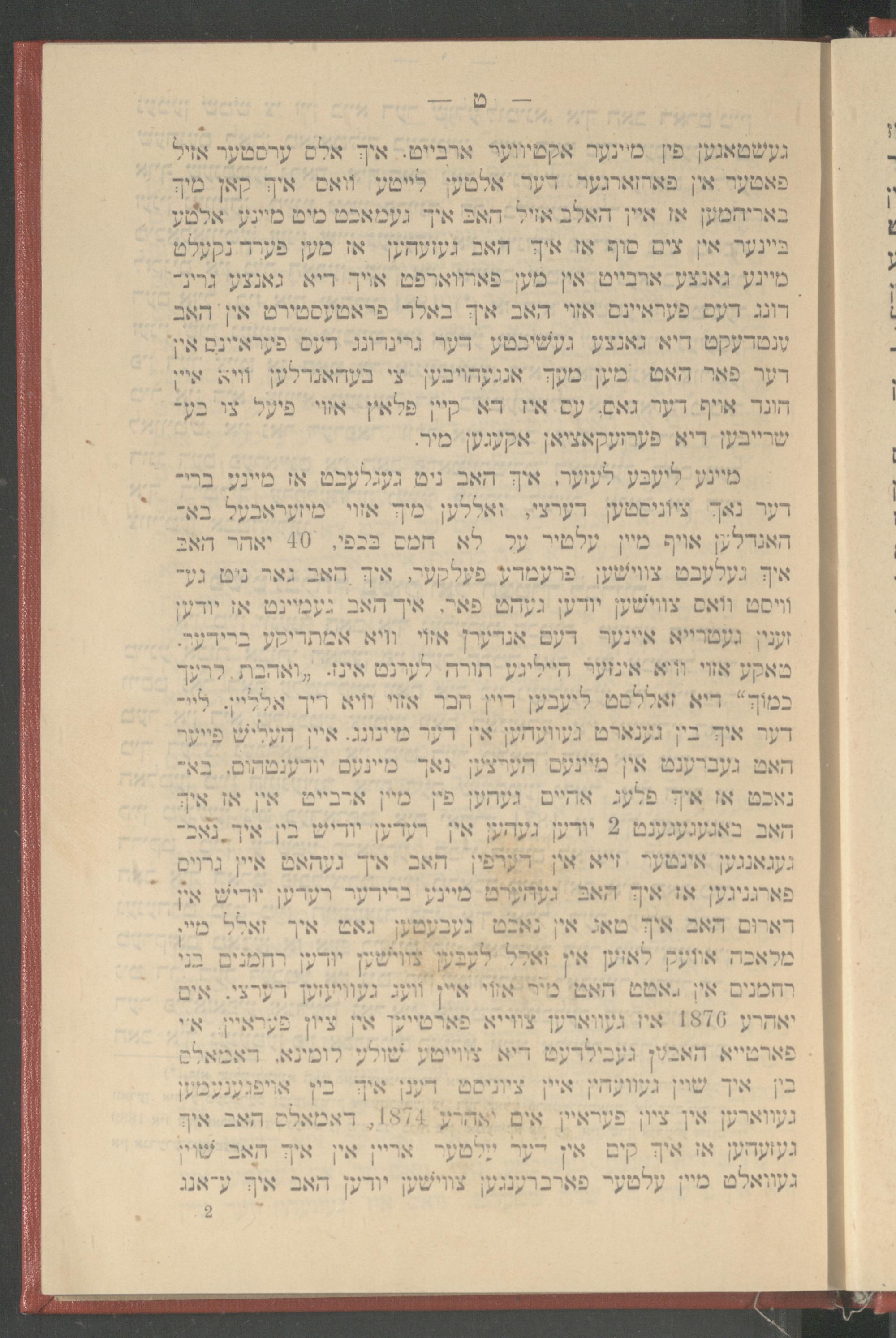 פארגניגען אז איך האב געהערט מיינע ברידער רעדען יודיש דארום האב איך טאג אין נאכט געבעטען גאט איך זאלל מיין מלאכה אוועק לאזען אין זאלל לעבען צווישען יודען רחמנים בני רחמנים אין גאטט האט מיר אזוי איין וועג געוויעזען דערצי. אים יאהרע 1876 איז געווארען צווייא פארטייען אין ציון פעראיין. איי פארטייא האבען געבילדעט דיא צווייטע שולע לומינא, דאמאלס בין איך שוין געוועהין איין ציוניסט דענן איך בין אויפגענעמען געווארען אין ציון פעראיין אים יאהרע 1874, דאמאלס האב איך געזעהען אז איך קים אין דער עלטער אריין אין איך האב שוין געוואלט מיין עלטער פארברענגען צווישען יודען האב איך ע־אנג