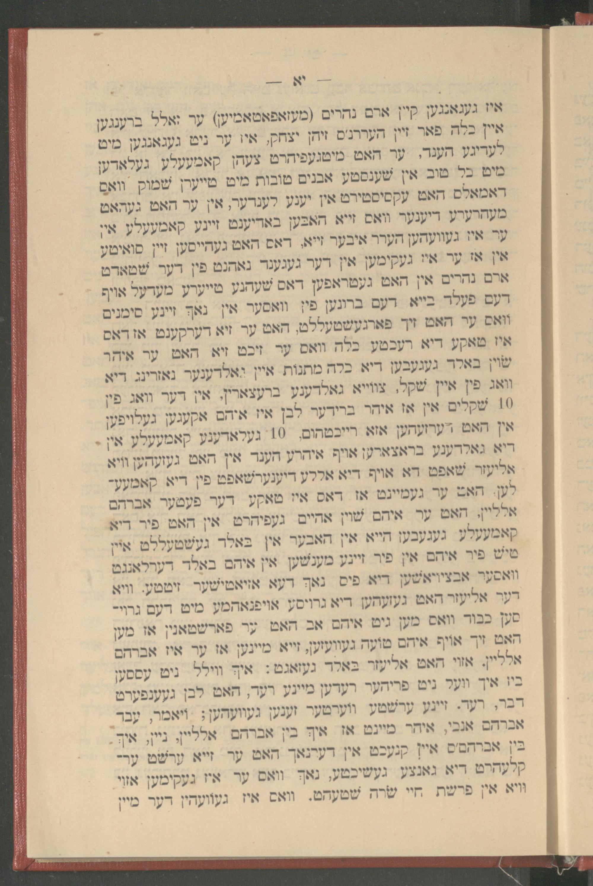 איז געגאנגען קיין ארם נהרים( מעזאפאטאמיען) ער זאלל ברענגען איין כלה פאר זיין העררנ'ס זיהן יצחק, איז ער ניט געגאנגען מיט לעדיגע הענד, ער האט מיטגעפיהרט צעהן קאמעעלע געלאדען מיט כל טוב אין שענסטע אבנים טובות מיט טייערן שמוק וואס דאמאלס האט עקסיסטירט אין יענע לענדער, אין ער האט געהאט מעהרערע דיענער וואס זייא האבען באדיענט זיינע קאמעעלע אין ער איז געוועהען הערר איבער זייא, דאס האט געהייסען זיין סואיטע אין אז ער איז געקימען אין דער געגענד נאהנט פין דער שטאדט ארם נהרים אין האט געטראפען דאס שעהנע טייערע מעדעל אויף דעם פעלד בייא דעם ברונען פין וואסער אין נאך זיינע סימנים וואס ער האט זיך פארגעשטעללט, האט ער זיא דערקענט אז דאס איז טאקע דיא רעכטע כלה וואס ער זיכט זיא האט ער איהר שוין באלד געגעבען דיא כלה מתנות אין גאלדענער נאזרינג דיא וואג פין איין שקל, צווייא גאלדענע ברעצארין, אין דער וואג פין 10 שקלים אין אז איהר ברידער לבן אין איהם אקעגען געלויפען אין האט דערזעהען אזא רייכטהום, 10 געלאדענע קאמעעלע אין דיא גאלדענע בראצארען אויף איהרע הענד אין האט געזעהען וויא אליעזר שאפט דא אויף דיא אללע דיענערשאפט פין דיא קאמעע־ לען. האט ער געמיינט אז דאס איז טאקע דער פעטער אברהם אלליין, האט ער איהם שוין אהיים געפיהרט אין האט פיר דיא קאמעעלע געגעבען הייא אין האבער אין באלד געשטעללט איין טיש פיר איהם אין פיר זיינע מענשען אין איהם באלד דערלאנגט וואסער אבציוואשען דיא פיס נאך דעא אזיאטישער זיטטע. וויא דער אליעזר האט געזעהען דיא גרויסע אויפנאהמע מיט דעם גרוי־ סען כבוד וואס מען גיט איהם אב האט ער פארשטאנין אז מען האט זיך אויף איהם טועה געוועזען, זייא מיינען אז ער איז אברהם אלליין, אזוי האט אליעזר באלד געזאגט: איך ווילל ניט עססען בין איך וועל ניט פריהער רעדען מיינע רעד, האט לבן געענפערט דבר, רעד. זיינע ערשטע ווערטער זענען געוועהען; ויאמר, עבד אברהם אנכי, איהר מיינט אז איך בין אברהם אלליין, ניין, איך- בין אברהם'ס איין קנעכט אין דערנאך האט ער זייא ערשט ער־ קלעהרט דיא גאנצע געשיכטע, נאך וואס ער איז געקומען אזוי וויא אין פרשת חיי שרה שטעהט, וואס איז געוועהין דער מיין