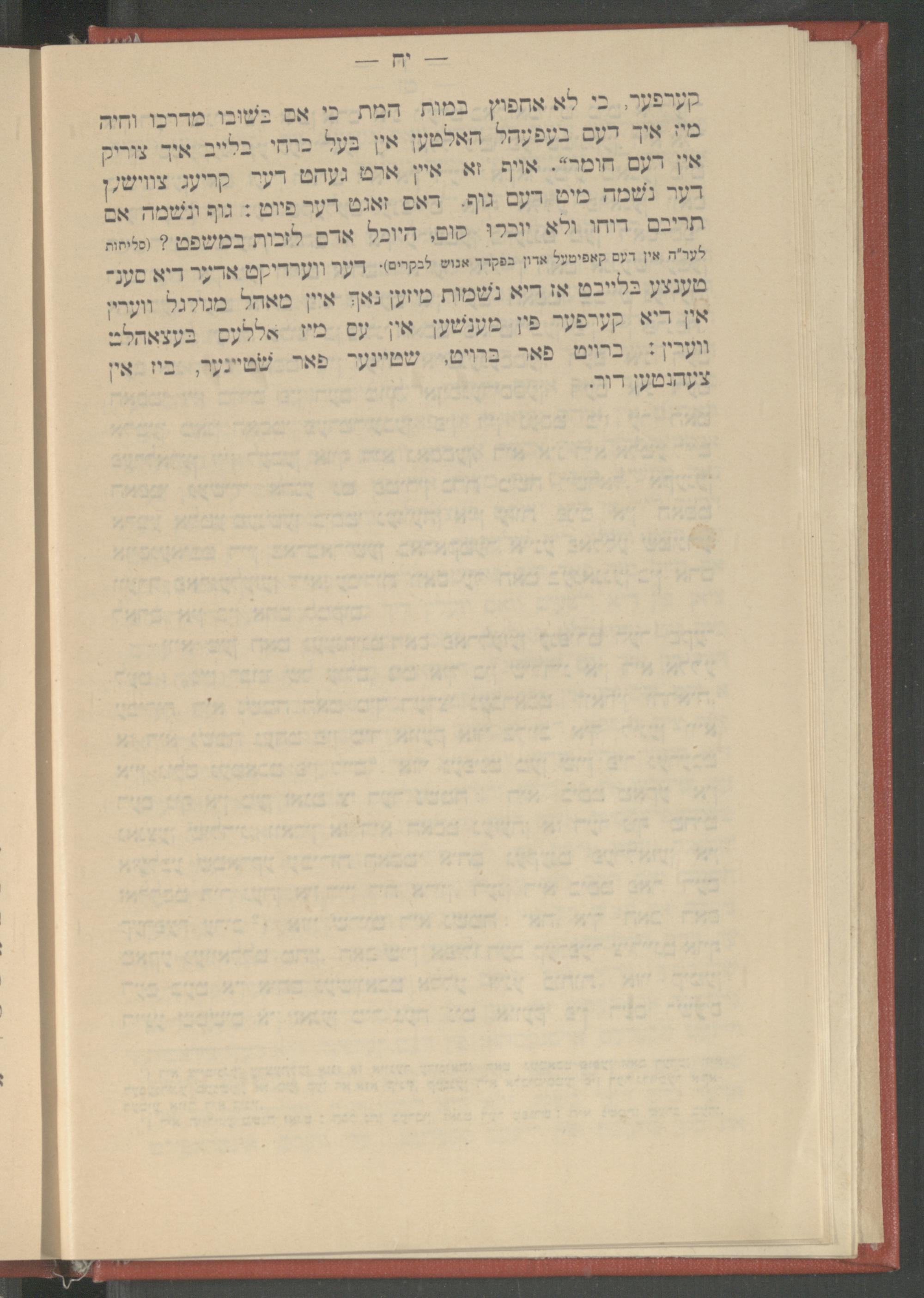 קערפער, כי לא אחפוץ במות המת כי אם בשובו מדרכו וחיה מיז איך דעם בעפעהל האלטען אין בעל כרחי בלייב איך צוריק אין דעם חומר". אויף זא איין ארט געהט דער קריעג צווישען דער נשמה מיט דעם גוף. דאס זאגט דער פיוט: גוף ונשמה אם תריבם דוחו, ולא יוכלו קום, היוכל אדם לזכות במשפט?( סליחות לער"ה אין דעם קאפיטעל אדון בפקדך אנוש לבקרים). דער ווערדיקט אדער דיא סענ־ טענצע בלייבט אז דיא נשמות מיזען נאך איין מאהל מגולגל ווערין אין דיא קערפער פין מענשען אין עס מיז אללעס בעצאהלט ווערין: ברויט פאר ברויט, שטיינער פאר שטיינער, ביז אין צעהנטען דור.