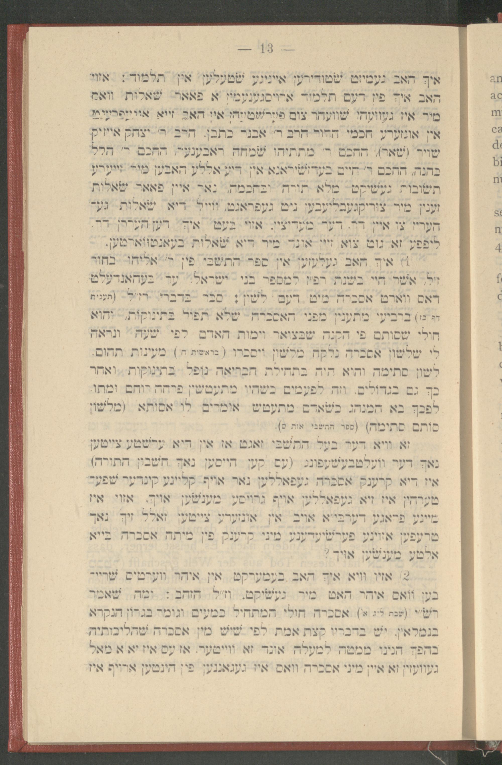 איך האב געמייט שטודירען אייניגע שטעלען אין תלמוד: אזוי האב איך פין דעם תלמוד ארויסגענעמין א פאאר שאלות וואס מיר איז געוועהן שוועהר צום פערשטעהן אין האב זייא אויפריוט אין אונזערע חכמי הדור הרב ר' אבנר כתבן. הרב ר' יצחק אייזיק שויר( שאר), החכם ר' מתתיהו שמחה ראבענער, החכם ר' הלל כהנה, החכם ר' חיים בעד שיראנא אין דיע אללע האבען מיר זייערע תשובות געשיקט מלא תורה ובחכמה, נאר איין פאאר שאלות זענין מיר צוריקגעבליעבען ניט געפראגט, ווייל דיא שאלות גע־ העריז צו איין דר. דער מעדיצין. אזוי בעט איך דען העררן דר. ליפפע זא גוט צוא זיין אונד מיר דיא שאלות בעאנטווארטען. 1) איך האב געלעזען אין ספר התשבי פין ר' אליהו בחור אשר חיי בשנת רפ"ן למספר בני ישראל. ער בעהאנדעלט דאס ווארט אסכרה מיט דעם לשון: סבר בדברי רז"ל( תענית דף כז) ברביעי מתענין מפני האסכרה שלא תפול בתינוקות, והוא חולי שסותם פי הקנה שבצואר וימות האדם לפי שעה ונראה שלשון אסכרה נלקח מלשון ויסברו( בראשית ח) מעינות תהום. לשון סתימה והוא היה בתחילת הבריאה נופל בתינוקות ואחר כך גם בגדולים. וזה לפעמים כשהיו מתעטשן פרחה רוחם ומתו. לפכך בא המנהג כשאדם מתעטש אומרים לו אסותא( מלשׁוֹן סותם סתימה)( ספר התשבי אות ס).
