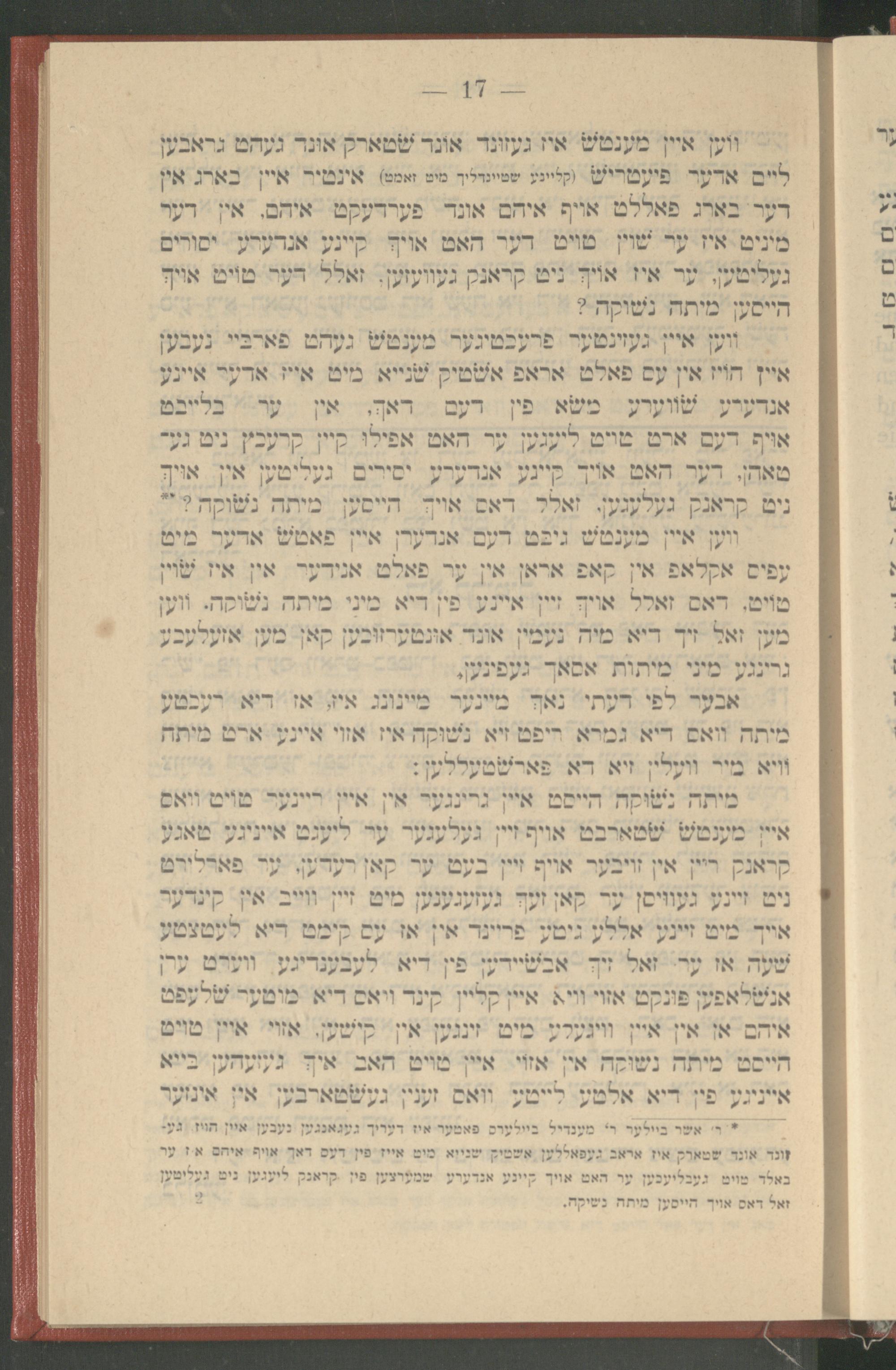 מיתה נשוקה הייסט איין גרינגער אין איין ריינער טויט וואס איין מענטש שטארבט אויף זיין געלעגער ער ליעגט אייניגע טאגע קראנק ריין אין זויבער אויף זיין בעט ער קאן רעדען, ער פארלירט ניט זיינע געוויסן ער קאן זעך געזעגענען מיט זיין ווייב אין קינדער אויך מיט זיינע אללע גיטע פריינד אין אז עס קימט דיא לעטצטע שעה אז ער זאל זיך אבשיידען פון דיא לעבענדיגע ווערט ערן אנשלאפען פּונקט אזוי וויא איין קליין קינד וואס דיא מוטער שלעפט איהם אן אין איין וויגעלע מיט זינגען אין קישען, אזוי איין טויט הייסט מיתה נשוקה אין אזוי איין טויט האב איך געזעהען בייא אייניגע פון דיא אלטע לייטע וואס זענין געשטארבען אין אינזער * ר' אשר ביילער ר' מענדיל ביילערס פאטער איז דעריך געגאנגען געבען איין הויז געזונד אונד שטארק איז אראב געפאללען אשטיק שנייא מיט אייז פין דעס דאך אויף איהם איז ער באלד טויט געבליעכען ער האט אויך קיינע אנדערע שמערצען פון קראנק ליעגען ניט געליטען