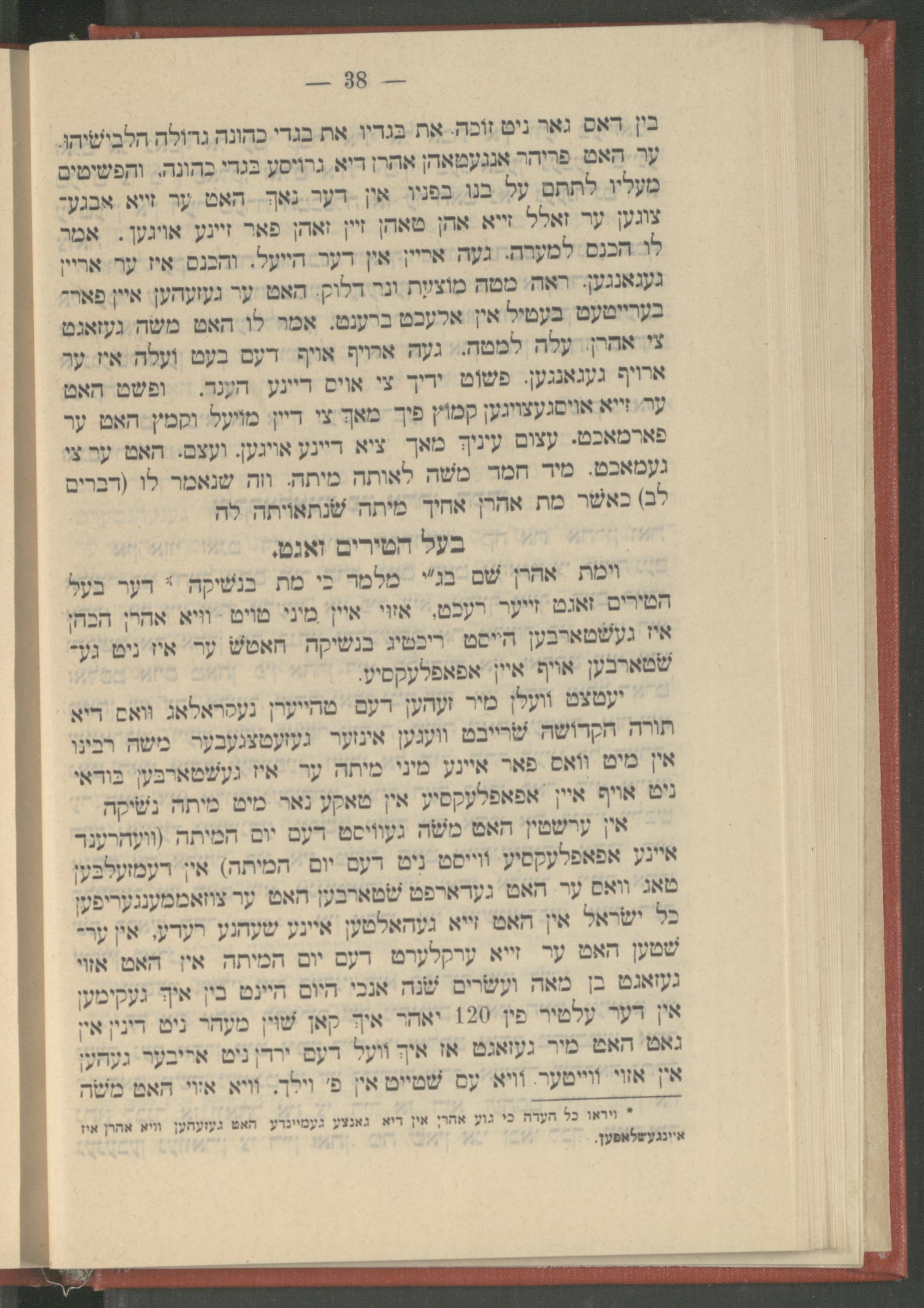 וימת אהרן שם בג"י מלמד כי מת בנשיקה* דער בעל הטירים זאגט זייער רעכט, אזוי איין מיני טויט וויא אהרן הכהן איז געשטארבען הייסט ריכטיג בנשיקה האט ער איז ניט גע־ שטארבען אויף איין אפאפלעקסיע. יעטצט וועלן מיר זעהען דעם טהייערן געקראלאג, וואס דיא תורה הקדושה שרייבט וועגען אינזער געזעטצגעבער משה רבינו אין מיט וואס פאר איינע מיני מיתה ער איז געשטארבען בודאי ניט אויף איין אפאפלעקסיע אין טאקע נאר מיט מיתה נשיקה אין ערשטין האט משה געוויסט דעם יום המיתה( וועהרענד איינע אפאפלעקסיע ווייסט ניט דעם יום המיתה) אין דעמזעלבען טאג וואס ער האט געדארפט שטארבען האט ער צוזאממענגעריפען כל ישראל אין האט זייא געהאלטען איינע שעהנע רעדע, אין ער־ שטען האט ער זייא ערקלערט דעם יום המיתה אין האט אזוי געזאגט בן מאה ועשרים שנה אנכי היום היינט בין איך געקימען אין דער עלטיר פין 120 יאהר איך קאן שוין מעהר ניט דינין אין גאט האט מיר געזאגט אז איך וועל דעם ירדן ניט אריבער געהען אין אזוי ווייטער. וויא עס שטייט אין פ' וילך. וויא אזוי האט משה ויראו כל העדה כי גוע אהרן אין דיא גאנצע געמיינדע האט געזעהען וויא אהרן איז