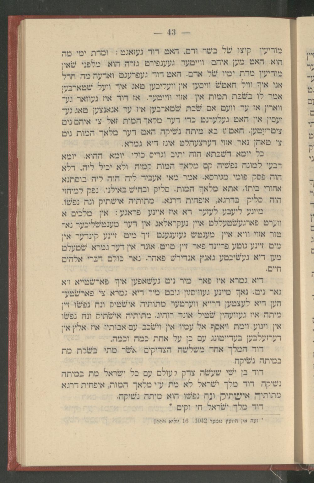 מודיעין קיצו של בשר ודם. האט דוד געזאגט: ומדת ימי מה הוא. האט מען איהם ווייטער געענפירט גזרה הוא מלפני שאין מודיעין מדת ימיו של אדם. האט דוד געפרעגט ואדעה מה חדל אני איך וויל האטש וויסען אין וועליכען טאג איך וועל שטארבען אמר לו בשבת תמות אין אזוי ווייטער. אז דוד איז געוואר גע־ ווארין אז ער וועט אם שבת שטארבען איז ער אנאנצען טאג גע־ זעסין אין האט געלערנט כדי דער מלאך המות זאל צי איהם ניט ציטרעטען. האט בא מיתה נשיקה האט דער מלאך המות ניט צי טאהן נאר אזוי דערצעהלט אינז דיא גמרא. כל יומא דשבתא הוה יתיב וגריס כולי יומא ההוא. יומא דבעי למונח נפשיה קם מלאך המות קמיה ולא יכיל ליה. דלא הוה פסק פומי מגירסא. אמר מאי אעביד ליה הוה ליה בוסתנא אחורי ביתו. אתא מלאך המות. סליק ובחישׁ באילני. נפק למיחזי הוה סליק בדרגא, איפחית דרגא. מתותיה אישתיק ונח נפשו. מיינע ליעבע לעזער דא איז איינע פראגע: אין מלכים א ווערט פארגעשטעללט איין געקראלאג אין דער מענטשליכער נאי טור אזוי וויא איין מענטש געזעגענט זיך מיט זיינע קינדער אין מיט זיינע גוטע פריינד פאר זיין טויט. אונד אין דער גמרא שטעלט מען דיא געשיכטע גאנץ אנדירש פאהר. נאר כולם דברי אלהים