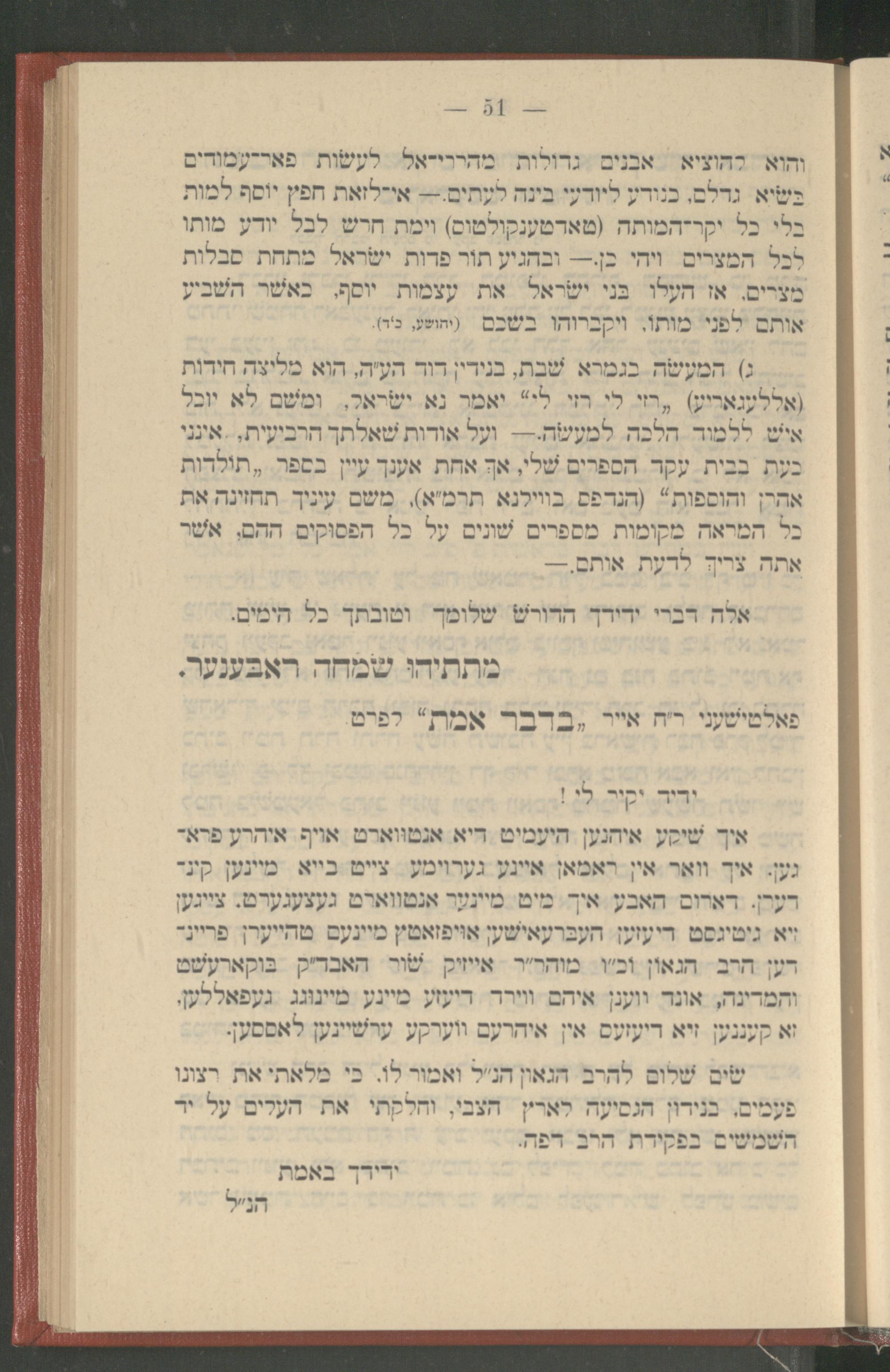 זא קעננען זיא דיעזעס אין איהרעם ווערקע ערשיינען לאססען. שים שלום להרב הגאון הנ"ל ואמור לו, כי מלאתי את רצונו פעמים, בנידון הנסיעה לארץ הצבי, וחלקתי את העלים על יד השמשים בפקידת הרב דפה.