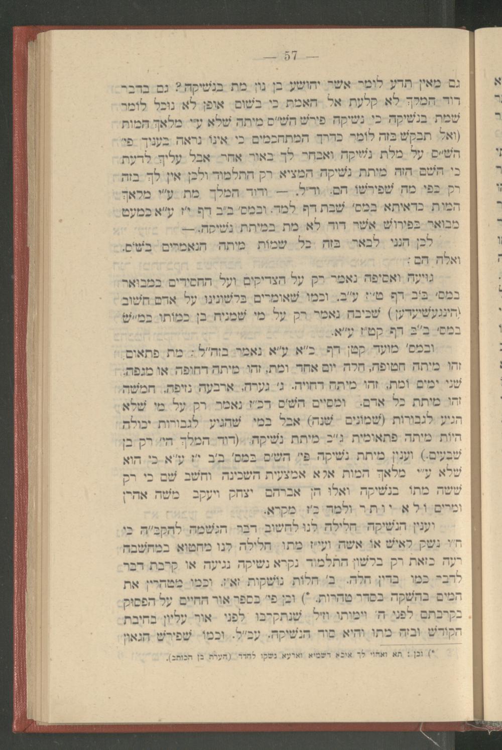 גם מאין תדע לומר אשר יהושע בן נון מת בנשיקה? גם בדבר") דוד המלך לא קלעת אל האמת כי בשום אופן לא נוכל לומר שמת בנשיקה כי נשיקה פירש הש"ס מיתה שלא ע"י מלאך המות- ( ואל תבקש בזה לומר כדרך המתחכמים כי אינו נראה בעניך פי'ה השים על מלת נשיקה ואבחר לך באור אחר אבל עליך לדעת. כי השם הזה מיתת נשיקה המציא רק התלמוד ולכן אין לך בזה רק כפי מה שפירשו הם. וד"ל.- ודוד המלך מת ע"י מלאך המות כדאיתא במס' שבת דף למד. ובמס' ב"ב דף י"ז ע"א כמעט מבואר בפירוש אשר דוד לא מת במיתת נשיקה.— לכן הנני לבאר בזה כל שמות מיתה הנאמרים בש"ס.