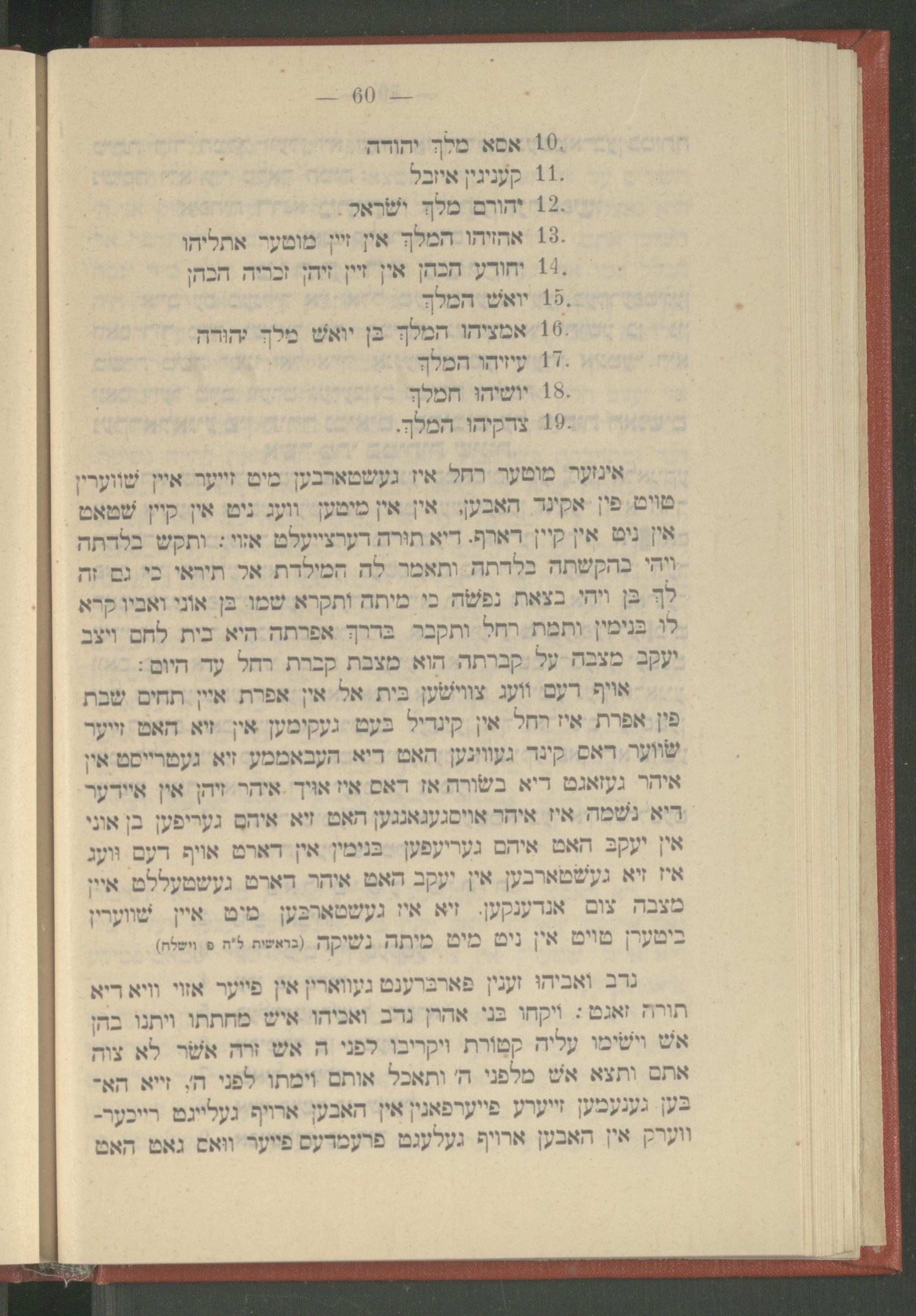 אינזער מוטער רחל איז געשטארבען מיט זייער איין שווערין טויט פין אקינד האבען, אין אין מיטען וועג ניט אין קיין שטאט אין ניט אין קיין דארף. דיא תורה דערצייעלט אזוי: ותקש בלדתה ויהי בהקשתה בלדתה ותאמר לה המילדת אל תיראי כי גם זה לך בן ויהי בצאת נפשה כי מיתה ותקרא שמו בן אוני ואביו קרא לו בנימין ותמת רחל ותקבר בדרך אפרתה היא בית לחם ויצב יעקב מצבה על קברתה הוא מצבת קברת רחל עד היום:-)) אויף דעם וועג צווישען בית אל אין אפרת איין תחים שבת פין אפרת אין רחל אין קינדיל בעט געקומען אין זיא האט זייער שווער דאס קינד געווינען האט דיא העבאממע זיא געטרייסט אין איהר געזאגט דיא בשורה אז דאס איז אויך איהר זיהן אין איידער דיא נשמה איז איהר אויסגעגאנגען האט זיא איהם געריפען בן אוני אין יעקב האט איהם געריעפען בנימין אין דארט אויף דעם וועג איז זיא געשטארבען אין יעקב האט איהר דארט געשטעללט איין מצבה צום אנדענקען. זיא איז געשטארבען מיט איין שווערין