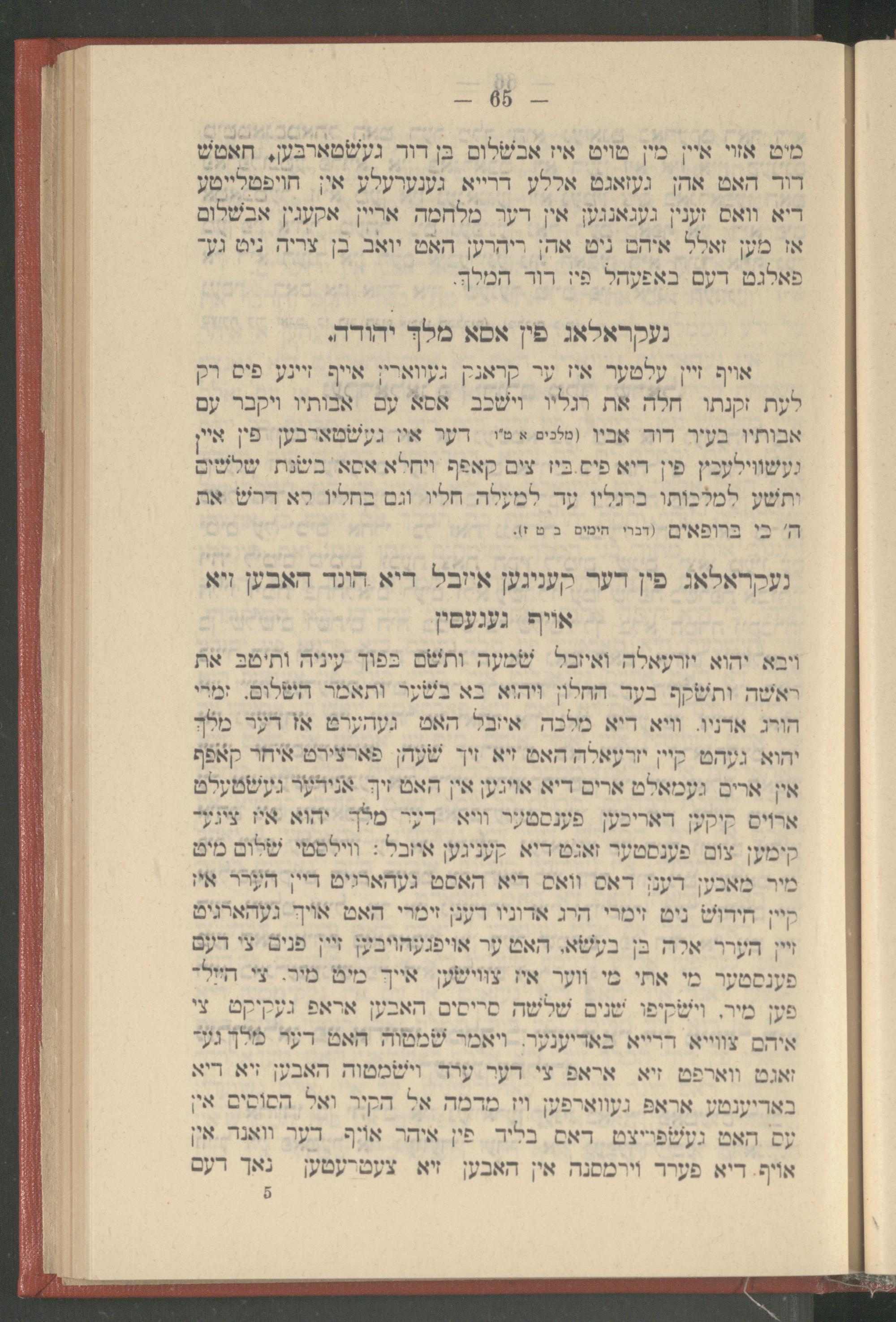 מיט אזוי איין מין טויט איז אבשלום בן דוד געשטארבען, האטש דוד האט אהן געזאגט אללע דרייא גענערעלע אין הויפטלייטע דיא וואס זענין געגאנגען אין דער מלחמה אריין אקעגין אבשלום אז מען זאלל איהם ניט אהן ריהרען האט יואב בן צריה ניט גע־ פאלגט דעם באפעהל פין דוד המלך.