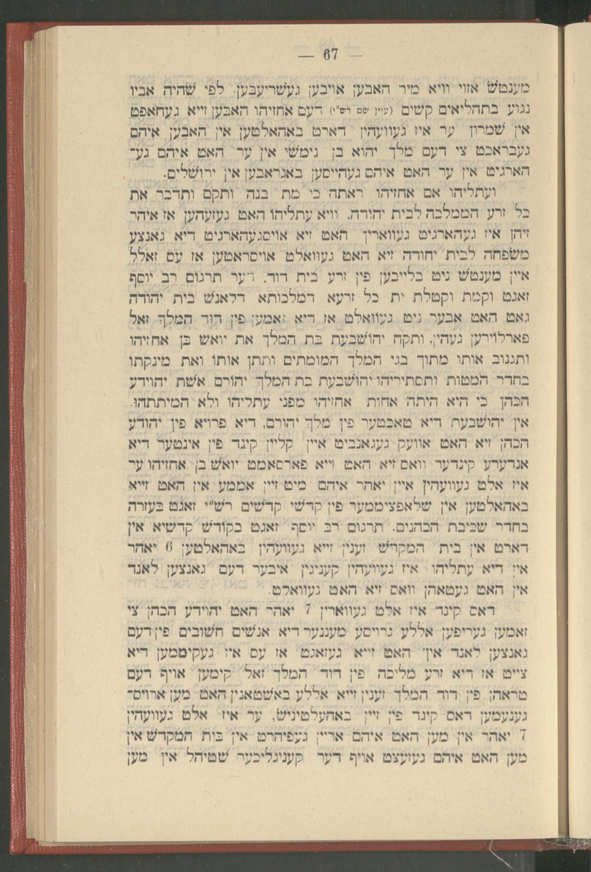 אין האט געטאהן וואס זיא האט געוואלט. דאס קינד איז אלט געווארין 7 יאהר האט יהוידע הכהן צי זאמען געריפען אללע גרויסע מעננער דיא אנשים חשובים פין דעם גאנצען לאנד אין האט זייא געזאגט אז עס איז געקיטמען דיא צייט אז דיא זרע מליכה פין דוד המלך זאל קימען אויף דעם טראהן פין דוד המלך זענין זייא אללע באשטאנין האט מען ארויס־ גענעמען דאס קינד פון זיין באהעלטיניש, ער איז אלט געוועהין ד יאהר אין מען האט איהם אריין געפֿיהרט אין בית המקדש אין מען האט איהם געזעצט אויף דער קעניגליכער שטיהל אין מען