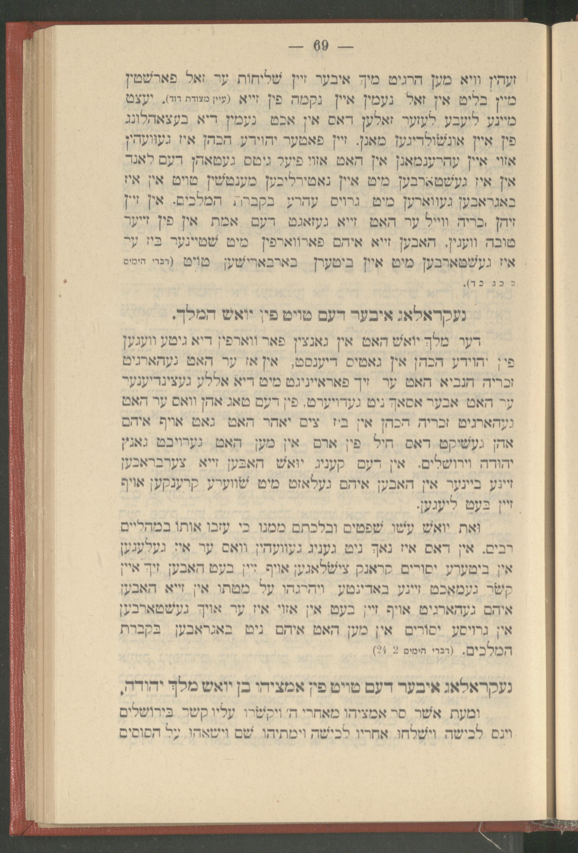 זעהין וויא מען הרגיט מיך איבער זיין שליחות ער זאל פארשטין מיין בליט אין זאל נעמין איין נקמה פין זייא( עיין מצודת דוד). יעצט מיינע ליעבע לעזער זאלען דאס אין אכט נעמין דיא בעצאהלונג פין איין אונשולדיגען מאגן. זיין פאטער יהוידע הכהן איז געוועהין אזוי איין עהרענמאנן אין האט אזוי פיעל גיטס געטאהן דעם לאנד אין איז געשטארבען מיט איין נאטירליכען מענטשין טויט אין איז באגראבען געווארען מיט גרויס עהרע בקברת המלכים. אין זיין זיהן כריה ווייל ער האט זייא געזאגט דעם אמת אין פין זייער טובה וועגין, האבען זייא איהם פארווארפין מיט שטיינער ביז ער איז געשטארבען מיט איין ביטערן בארבארישען טוֹיט( דברי הימים
