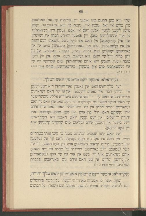 ואת יואש עשו שפטים ובלכתם ממנו. כי עזבו אותו במהליים. רבים. אין דאס איז נאך ניט געניג געוועהין וואס ער איז געלעגען אין ביטערע יסורים קראנק צישלאגען אויף זיין בעט האבען זיך איין קשר געמאכט זיינע באדינטע ויהרגהו על מטתו אין זייא האבען איהם געהארגיט אויף זיין בעט אין אזוי איז ער אויך געשטארבען אין גרויסע יסורים אין מען האט איהם ניט באגראבען בקברת המלכים.( דברי הימים 2 24)