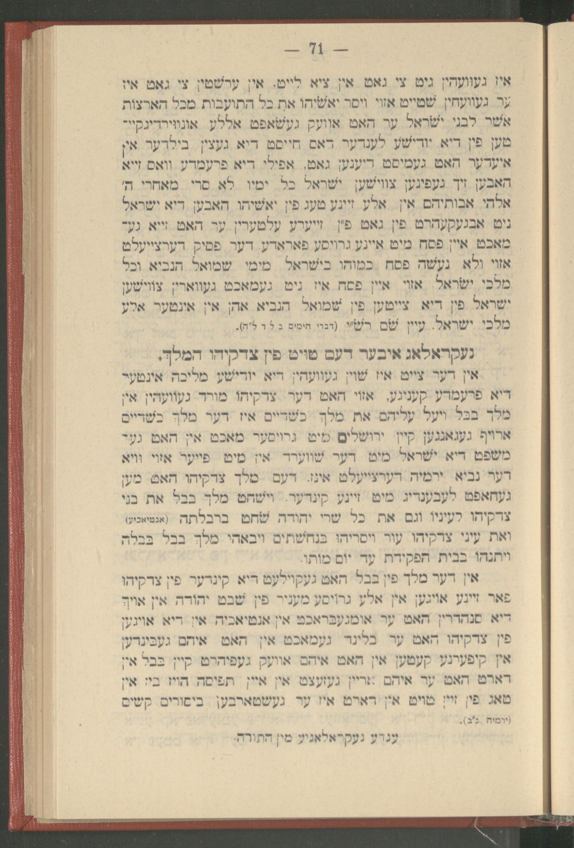 געקראלאג איבער דעם טויט פין צדקיהו המלך. אין דער צייט איז שוין געוועהין דיא יודישע מליכה אינטער דיא פרעמדע קעניגע, אזוי האט דער צדקיהו מורד געוועהין אין מלך בבל ויעל עליהם את מלך כשדיים איז דער מלך כשדיים ארויף געגאנגען קיין ירושלים מיט גרויסער מאכט אין האט גער משפט דיא ישראל מיט דער שווערד אין מיט פייער אזוי וויא דער נביא ירמיה דערצייעלט אינז, דעם מלך צדקיהו האט מען געהאפט לעבענדיג מיט זיינע קינדער. וישחט מלך בבל את בני צדקיהו לעיניו וגם את כל שרי יהודה שחט ברבלתה( אנטיאכיע) ואת עיני צדקיהו עור ויסריהו בנחשתים ויבאהי מלך בבל בבלה ויתנהו בבית הפקידת עד יום מותו. אין דער מלך פין בבל האט געקוילעט דיא קינדער פין צדקיהו פאר זיינע אויגען אין אלע גרויסע מעניר פין שבט יהודה אין אויך דיא סנהדרין האט ער אומגעבראכט אין אנטיאכיה אין דיא אויגען פין צדקיהו האט ער בלינד געמאכט אין האט איהם געבינדען אין קיפערנע קעטען אין האט איהם אוועק געפיהרט קיין בבל אין דארט האט ער איהם אריין געזעצט אין איין תפיסה הויז ביז אין טאג פין זיין טויט אין דארט איז ער געשטארבען ביסורים קשים
