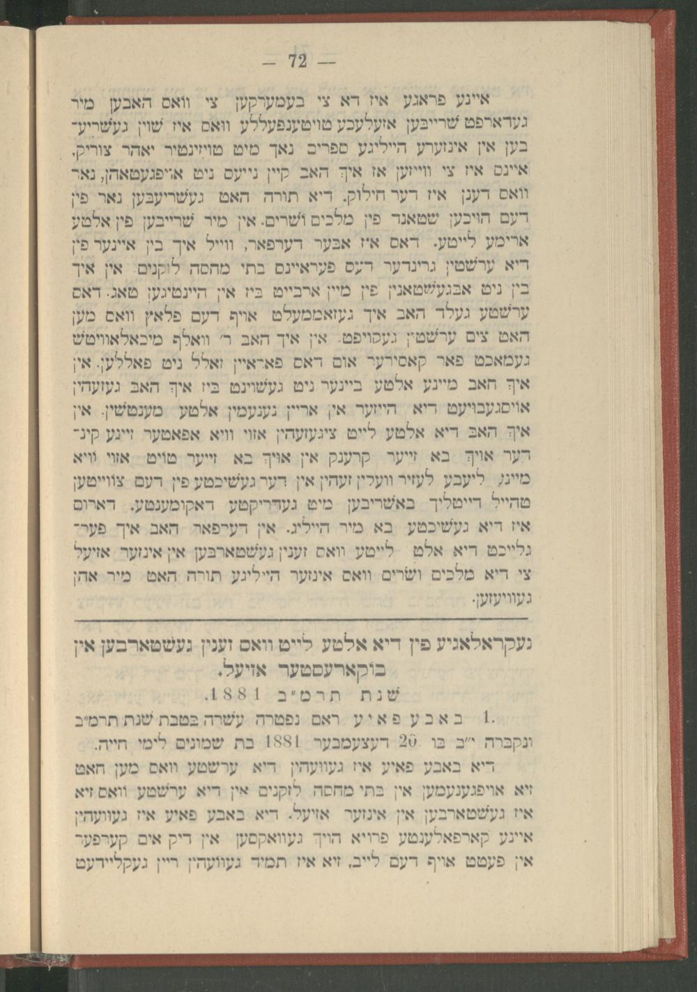 איינע פראגע איז דא צי בעמערקען צי וואס האבען מיר געדארפט שרייבען אזעלעכע טויטענפעללע וואס איז שוין געשריע־ בען אין אינזערע הייליגע ספרים נאך מיט טויזינטיר יאהר צוריק, איינס איז צי ווייזען אז איך האב קיין נייעס ניט אויפגעטאהן, נאר וואס דענן איז דער חילוק. דיא תורה האט געשריעבען נאר פין דעם הויכען שטאנד פין מלכים ושרים. אין מיר שרייבען פין אלטע ארימע לייטע. דאס איז אבער דערפאר, ווייל איך בין איינער פין דיא ערשטין גרינדער דעס פעראיינס בתי מחסה לזקנים. אין איך בין ניט אבגעשטאנין פין מיין ארבייט ביז אין היינטיגען טאג. דאס ערשטע געלד האב איך געזאממעלט אויף דעם פלאץ וואס מען האט צים ערשטין געקויפט. אין איך האב ר' וואלף מיכאלאוויטש געמאכט פאר קאסירער אום דאס פאראיין זאלל ניט פאללען. אין איך האב מיינע אלטע ביינער ניט געשיינט ביז איך האב געזעהין אויסגעבויעט דיא הייזער אין אריין גענעמין אלטע מענטשין. אין איך האב דיא אלטע לייט ציגעזעהין אזוי וויא אפאטער זיינע קיני דער אויך בא זייער קרענק אין אויך בא זייער טוֹיט אזוי וויא מיינע ליעבע לעזיר ווערין זעהין אין דער געשיכטע פון דעם צווייטען טהייל דייטליך באשריבען מיט געדריקטע דאקומענטע. דארוס איז דיא געשיכטע בא מיר הייליג. אין דערפאר האב איך פער־ גלייכט דיא אלט לייטע וואס זענין געשטארבען אין אינזער אזיעל צי דיא מלכים ושרים וואס אינזער הייליגע תורה האט מיר אהן געוויעזען.