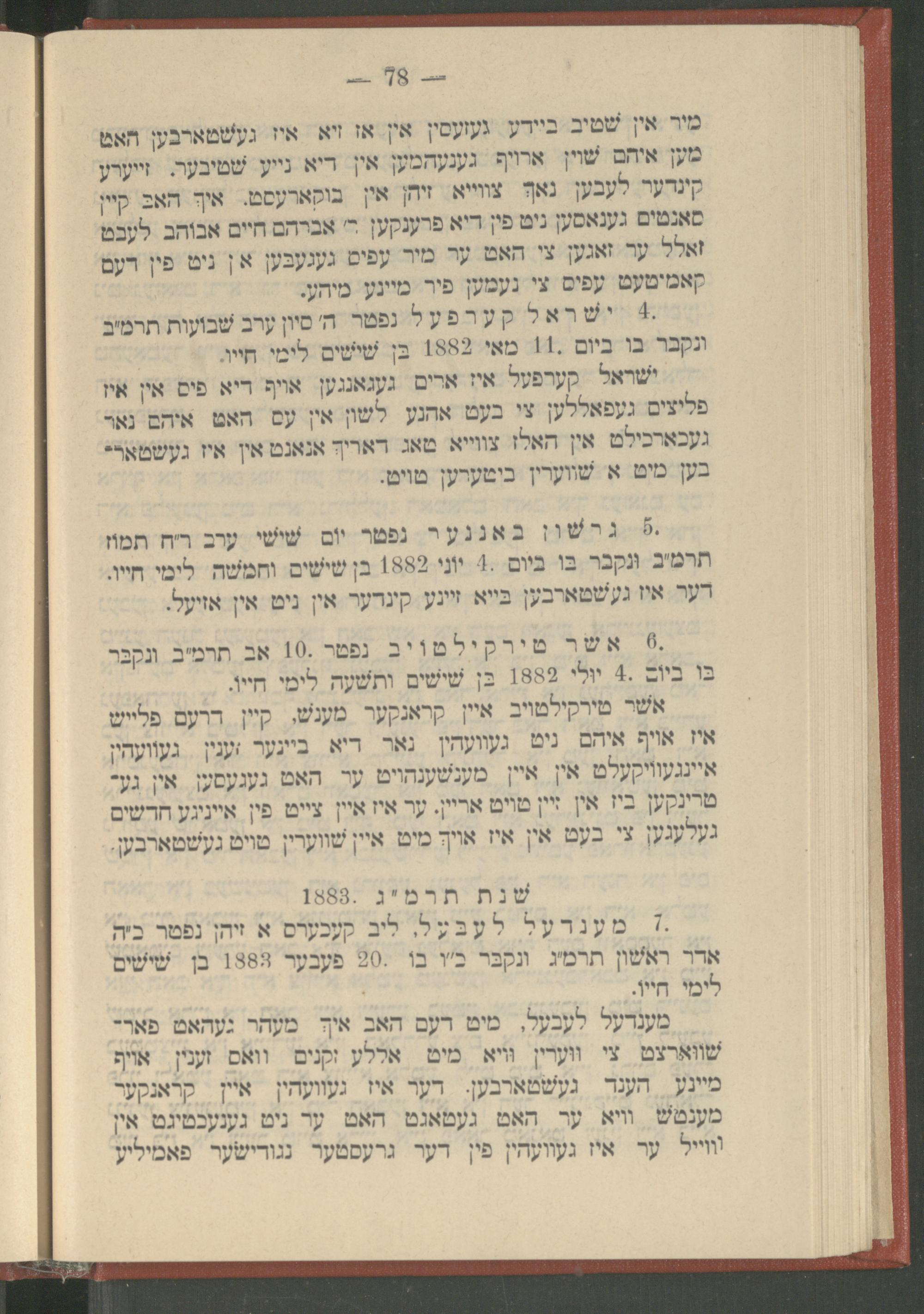 בו ביום.4 יולי 1882 בן שישים ותשעה לימי חייו. אשר טירקילטויב איין קראנקער מענש, קיין דרעם פלייש איז אויף איהם ניט געוועהין נאר דיא ביינער זענין געוועהין איינגעוויקעלט אין איין מענשענהויט ער האט געגעסען אין גע־ טרינקען ביז אין זיין טויט אריין. ער איז איין צייט פין אייניגע חדשים געלעגען צי בעט אין איז אויך מיט איין שווערין טויט געשטארבען.