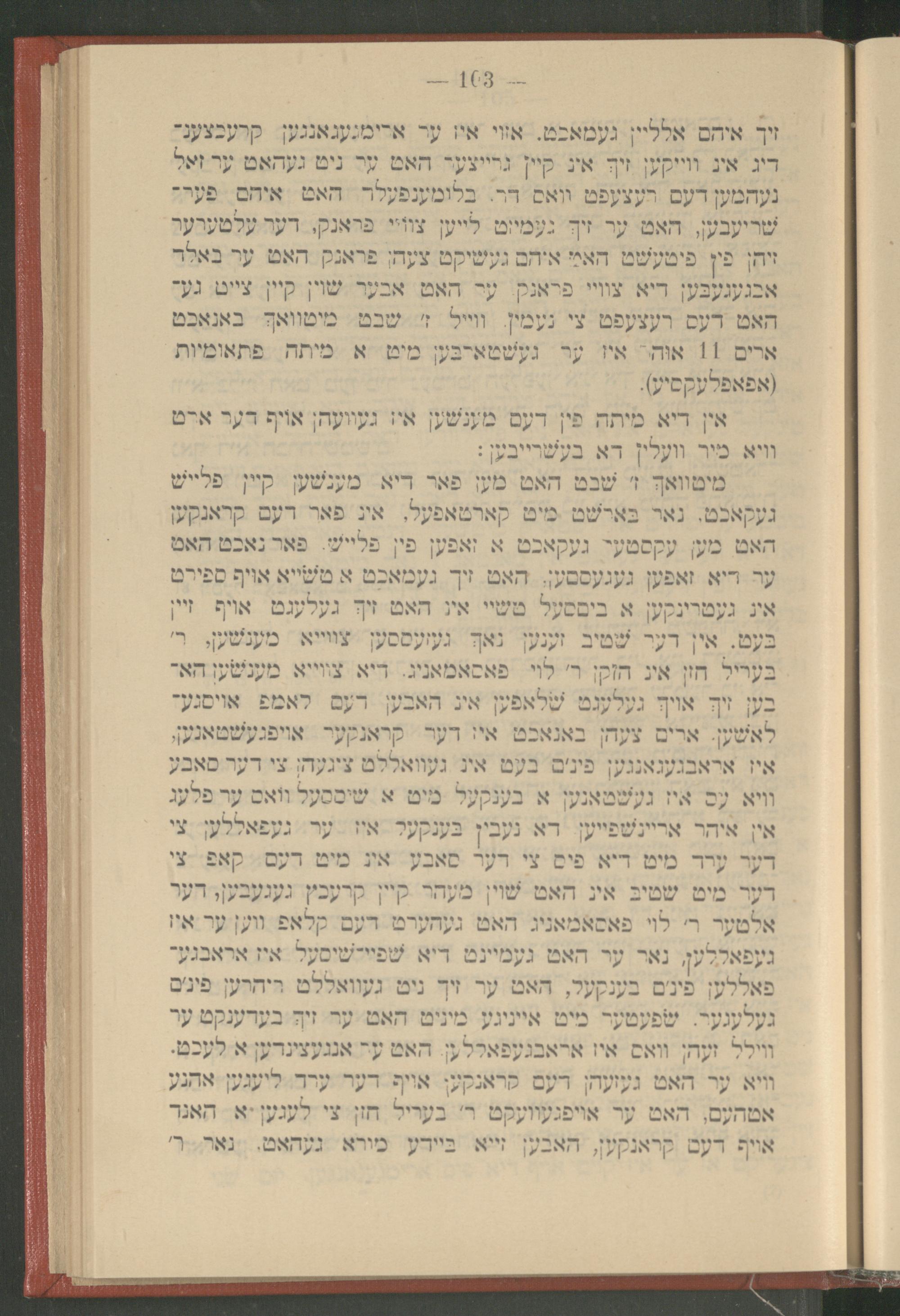 אין דיא מיתה פין דעם מענשען איז געוועהן אויף דער ארט וויא מיר וועלין דא בעשרייבען: מיטוואך ז' שבט האט מען פאר דיא מענשען קיין פלייש געקאכט. נאר בארשט מיט קארטאפעל, אין פאר דעם קראנקען האט מען עקסטער געקאכט א זאפען פין פלייש. פאר נאכט האט ער דיא זאפען געגעססען, האט זיך געמאכט א טשייא אויף ספירט אין געטרינקען א ביססעל טשיי אין האט זיך געלעגט אויף זיין בעט. אין דער שטיב זענען נאך געזעססען צווייא מענשען, ר' בעריל חזן אין הזקן ר' לוי פאסאמאניג. דיא צווייא מענשען הא־ בען זיך אויך געלעגט שלאפען אין האבען דעם לאמפ אויסגע־ לאשען. ארים צעהן באנאכט איז דער קראנקער אויפגעשטאנען, איז אראבגעגאנגען פינים בעט אין געוואללט ציגעהן צי דער סאבע וויא עס איז געשטאנען א בענקעל מיט א שיססעל וואס ער פלעג אין איהר אריינשפייען דא נעבין בענקער איז ער געפאללען צי דער ערד מיט דיא פיס צי דער סאבע אין מיט דעם קאפ צי דער מיט שטיב אין האט שוין מעהר קיין קרעכץ געגעבען, דער אלטער ר' לוי פאסאמאניג האט געהערט דעם קלאפ ווען ער איז געפאללען, נאר ער האט געמיינט דיא שפיי־שיסעל איז אראבגע־ פאללען פינים בענקעל, האט ער זיך ניט געוואללט ריהרען פינים געלעגער. שפעטער מיט אייניגע מיניט האט ער זיך בעדענקט ער ווילל זעהן וואס איז אראבגעפאללען האט ער אנגעצינדען א לעכט. וויא ער האט געזעהן דעם קראנקען אויף דער ערד ליעגען אהנע אטהעם, האט ער אויפגעוועקט ר' בעריל חזן צי לעגען א האנד