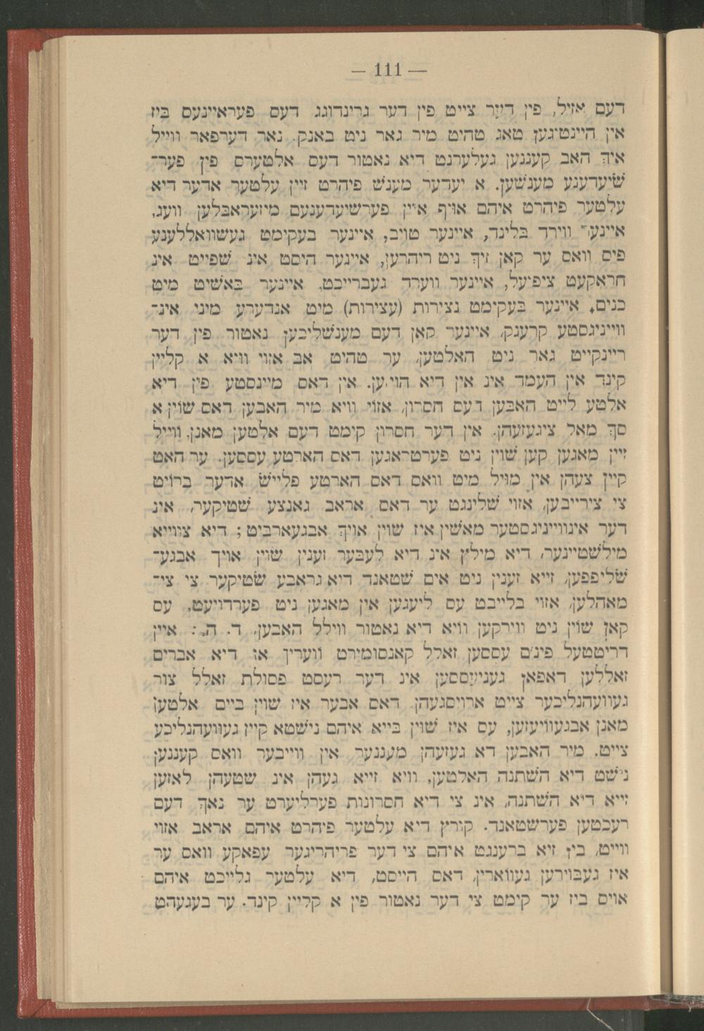 דעם אזיל, פין דער צייט פין דער גרינדונג דעס פעראיינעס ביז אין היינטיגען טאג טהיט מיר גאר ניט באנק. נאר דערפאר ווייל איך האב קעננען געלערנט דיא נאטור דעס אלטערס פין פער־ שיעדענע מענשען. א יעדער מענש פיהרט זיין עלטער אדער דיא עלטער פיהרט איהם אויף איין פערשיעדענעם מיזעראבלען וועג, איינער ווירד בלינד, איינער טוב, איינער בעקימט געשוואללענע פיס וואס ער קאן זיך ניט ריהרען, איינער היסט אין שפייט אין חראקעט ציפיעל, איינער ווערד געברייכט, איינער באשיט מיט כנים, איינער בעקימט נצירות( עצירות) מיט אנדערע מיני אינד ווייניגסטע קרענק, איינער קאן דעם מענשליכען נאטור פין דער ריינקייט גאר ניט האלטען, ער טהיט אב אזוי וויא א קליין קינד אין העמר אין אין דיא הויען. אין דאס מיינסטע פון דיא אלטע לייט האבען דעס חסרון, אזוי וויא מיר האבען דאס שוין א סך מאל ציגעזעהן. אין דער חסרון קימט דעם אלטען מאנן, ווייל זיין מאגען קען שוין ניט פערטראגען דאס הארטע עססען. ער האט קיין צעהן אין מויל מיט וואס דאס הארטע פלייש אדער ברויט צי צירייבען, אזוי שלינגט ער דאס אראב גאנצע שטיקער אין דער אינווייניגסטער מאשין איז שוין אויך אבגעארביט; דיא צווייא מילשטיינער, דיא מילץ אין דיא לעבער זענין שוין אויך אבגע־ שליפפען, זייא זענין ניט אים שטאנד דיא גראבע שטיקער צי צי־ מאהלען, אזוי בלייבט עס ליעגען אין מאגען ניט פערדויעט, עס קאן שוין ניט ווירקען וויא דיא נאטור ווילל האבען, ד. ה.: איין דריטטעל פינס עססען זאלל קאנסומירט ווערין אן דיא אברים זאללען דאפאן געניעססען אין דער רעסט פסולת זאלל צור געוועהנליכער צייט ארויסגעהן. דאס אבער איז שוין ביים אלטען מאנן אבגעוועזען, עס איז שוין בייא איהם נישטא קיין געוועהנליכע צייט. מיר האבען דא געזעהן מעננער אין ווייבער וואס קעננען נישט דיא השתנה האלטען, וויא זייא געהן אין שטעהן לאזען זייא דיא השתנה, אין צי דיא חסרונות פערליערט ער נאך דעם רעכטען פערשטאנד. קורץ דיא עלטער פיהרט איהם אראב אזוי ווייט, בין זיא ברענגט איהם צי דער פריהריגער עפאקע וואס ער איז געבוירען געווארין, דאס הייסט, דיא עלטער גלייכט איהם אויס ביז ער קימט צי דער נאטור פין א קליין קינד. ער בעגעהט