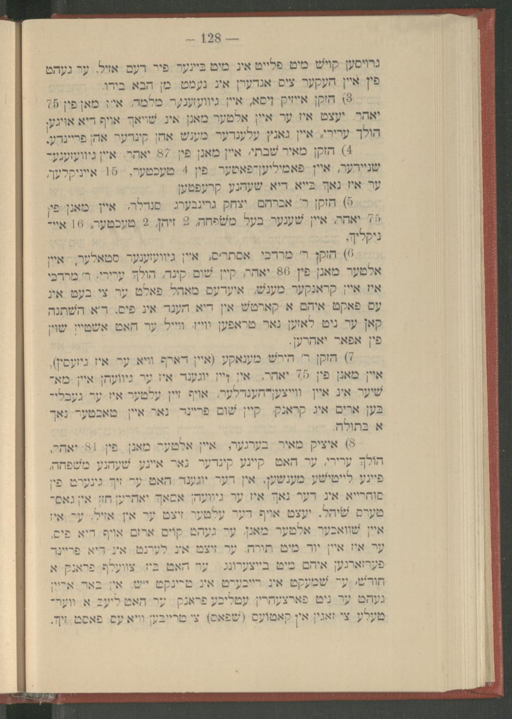 פין אפאר יאהרען. 7) הזקן ר' הירש מענאקע( איין דארף וויא ער איז גיזעסין), איין מאנן פין 75 יאהר, אין זיין יוגענד איז ער גיוועהן איין מא־ שיער אין איין ווייצען הענדלער, אויף זיין עלטער איז ער געבלי־ בען ארים אין קראנק קיין שום פריינד נאר איין טאכטער נאך א בתולה.