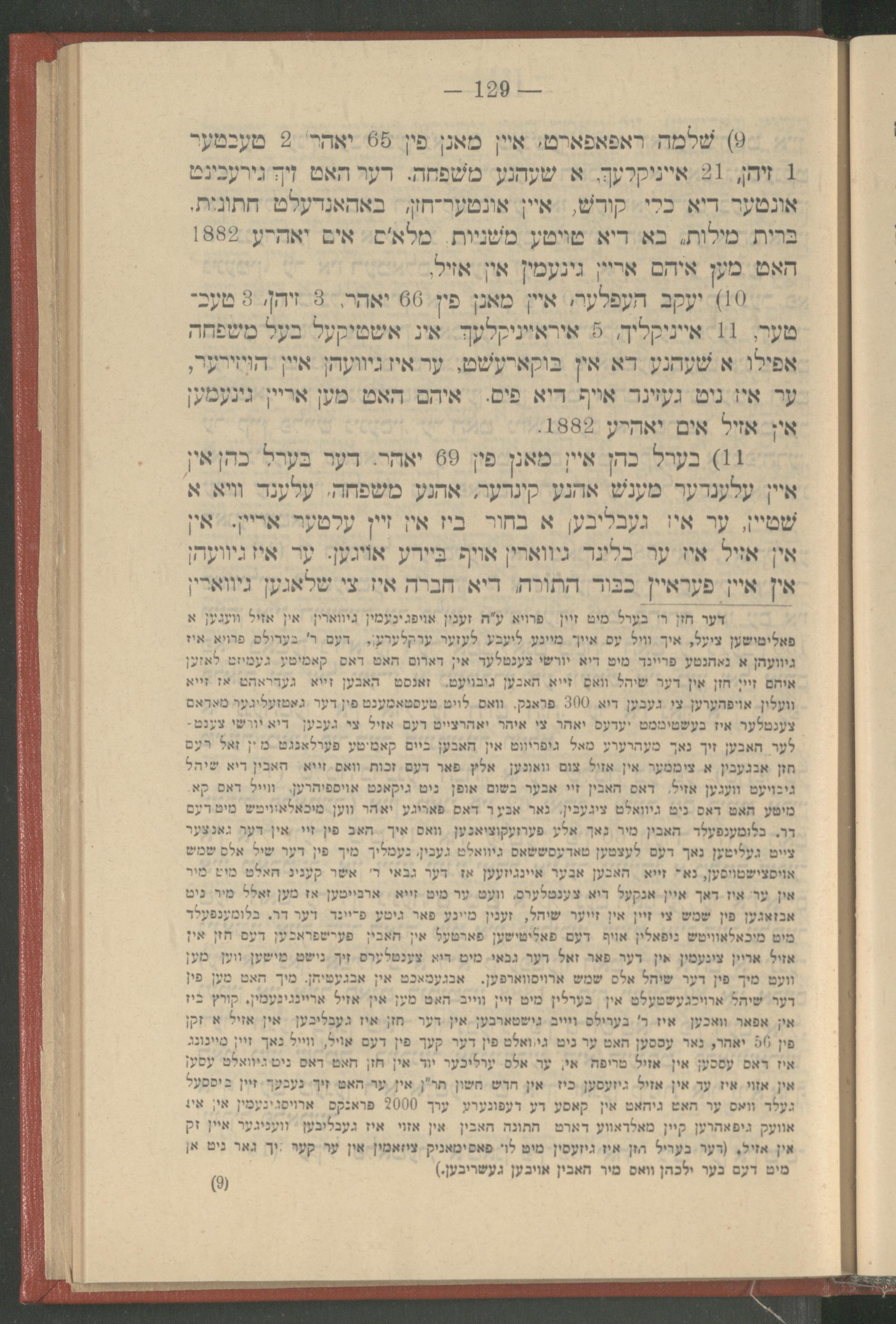 9) שלמה ראפאפארט, איין מאנן פין 65 יאהר 2 טעכטער 1 זיהן, 21 אייניקלעך, א שעהנע משפחה. דער האט זיך גירעכינט אונטער דיא כלי קודש, איין אונטער־חזן, באהאנדעלט חתונות. ברית מילות. בא דיא טויטע משניות. מלא'ס אים יאהרע 1882 האט מען איהם אריין גינעמין אין אזיל,