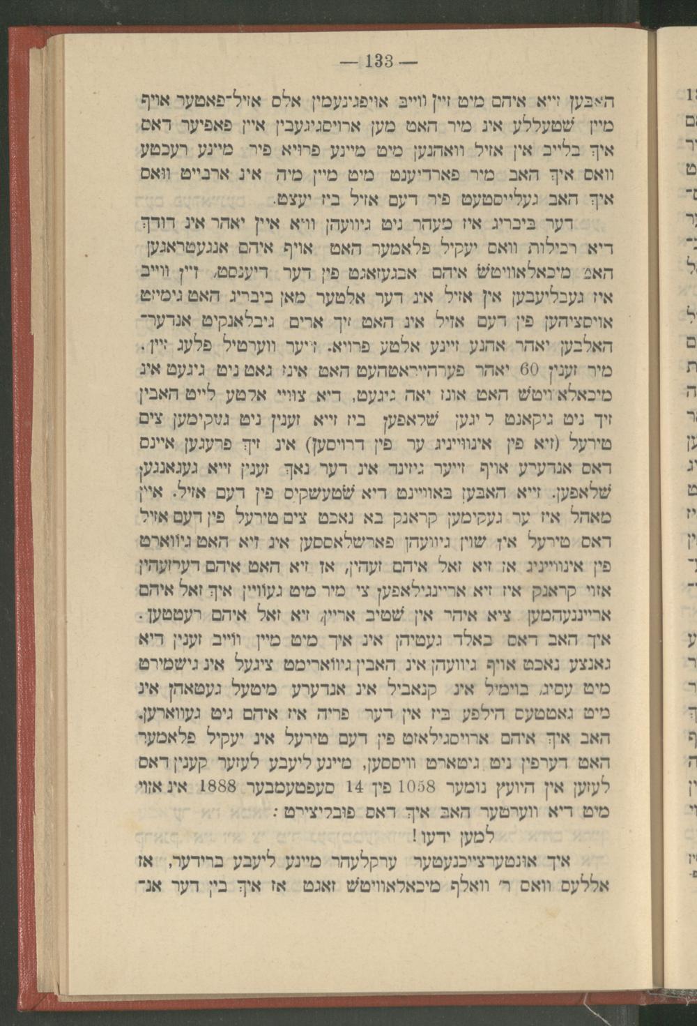ט דער ביבריג איז מעהר ניט גיוועהן וויא איין יאהר אין דודך דיא רכילות וואס יעקיל פלאמער האט אויף איהם אנגעטראגען האם מיכאלאוויטש איהם אבגעזאגט פין דער דיענסט, זיין ווייב איז געבליעבען אין אזיל אין דער אלטער מאן ביבריג האט גימיזט אויסציהען פין דעם אזיל אין האט זיך ארים גיבלאנקיט אנדער־ האלבען יאהר אהנע זיינע אלטע פרויא. זייער ווערטיל פלעג זיין. מיר זענין 60 יאהר פערהייראטהעט האט אינז גאט ניט גיגעט אין מיכאלא ויטש האט אונז יאה גיגעט, דיא צוויי אלטע לייט האבין זיך ניט גיקאנט ליגען שלאפען ביז זייא זענין ניט געקומען צים טירעל( זיא פין אינווייניג ער פין דרויסען) אין זיך פרעגען איינס דאס אנדערע אויף זייער גיזינד אין דער נאך זענין זייא געגאנגען שלאפען. זייא האבען באוויינט דיא שטעשקיס פין דעם אזיל. איין מאהל איז ער געקימען קראנק בא נאכט צים טירעל פין דעם אזיל דאס טירעל איז שוין גיוועהן פארשלאססען אין זיא האט גיווארט פין אינווייניג אן זיא זאל איהם זעהין, אז זיא האט איהם דערזעהין אזוי קראנק איז זיא אריינגילאפען צי מיר מיט געוויין איך זאל איהם ארייננעהמען ציא איהר אין שטיב אריין, זיא זאל איהם רעטטען. איך האב דאס באלד געטיהן אין איך מיט מיין ווייב זענין דיא גאנצע נאכט אויף גיוועהן אין האבין גיווארימט ציגעל אין גישמירט מיט עסיג, בוימיל אין קנאביל אין אנדערע מיטעל געטאהן אין מיט גאטטעס הילפע ביז אין דער פריה אין איהם גיט געווארען. האב איך איהם ארויסגילאזט פין דעם טירעל אין יעקיל פלאמער האט דערפין ניט גיטארט וויססען, מיינע ליעבע לעזער קענין דאס לעזען אין היועץ נומער 1058 פין 14 סעפטעמבער 1888 אין אזוי