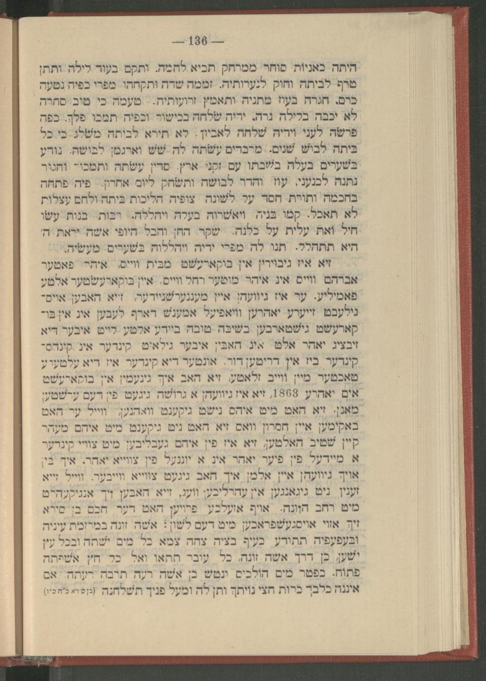 היתה כאניות סוחר ממרחק תביא לחמה. ותקם בעוד לילה ותתן טרף לביתה וחוק לנערותיה. זממה שדה ותקחהו מפרי כפיה נטעה כרם, חגרה בעוז מתניה ותאמץ זרועותיה. טעמה כי טוב סחרה לא יכבה בלילה נרה, ידיה שלחה בכישור וכפיה תמכו פלך. כפה פרשה לעני וידיה שלחה לאביון: לא תירא לביתה משלג כי כל ביתה לבוש שנים. מרבדים עשתה לה שש וארגמן לבושה. נודע בשערים בעלה בשבתו עם זקני ארץ. סדין עשתה ותמכור וחגור נתנה לכנעני, עוז והדר לבושה ותשחק ליום אחרון. פיה פתחה בחכמה ותורת חסד על לשונה צופיה הליכות ביתה ולחם עצלות לא תאכל. קמו בניה ויאשרוה בעלה ויהללה. רבות בנות עשו חיל ואת עלית על כלנה. שקר החן והבל היופי אשה יראת ה' היא תתהלל. תנו לה מפרי ידיה ויהללוה בשערים מעשיה.) זיא איז גיבוירין אין בוקארעשט מבית ווייס, איהר פאטער אברהם ווייס אין איהר מוטער רחל ווייס, איין בּוקארעשטער אלטע פאמיליע. ער איז גיוועהן איין מעננער שניידער, זייא האבען אויס־ גילעבט זייערע יאהרען וויאפיעל אמענש דארף לעבען אין אין בו־ קארעשט גישטארבען בשיבה טובה ביידע אלטע לייט איבער דיא זיבציג יאהר אלט אין האבין איבער גילאיט קינדער אין קינדסי קינדער ביז אין דריטען דור. אונטער דיא קינדער איז דיא עלטערע טאכטער מיין ווייב זלאטען זיא האב איך גינעמין אין בוקארעשט אים יאהרע 1863, זיא איז גיוועהן א גרושה גיגעט פין דעם ערשטען מאנן, זיא האט מיט איהס נישט גיקענט וואהנען, ווייל ער האט באקימען איין חסרון וואס זיא האט ניט גיקענט מיט איהם מעהר קיין שטיב האלטען, זיא איז פין איהם געבליבען מיט צוויי קינדער א מיידעל פין פיער יאהר אין א יוננעל פין צווייא יאהר. איך בין אויך גיוועהן איין אלמן איך האב גיגעט צווייא ווייבער, ווייל זייא זענין ניט גיגאנגען אין עהרליכען וועג, זייא האבען זיך אנגיקעהרט מיט רחב הזונה. אויף אזעלכע פרויען האט דער חכם בן סירא זיך אזוי אויסגעשפראכען מיט דעם לשון: אשה זונה במרזמת עיניה ובעפעפיה תתודע בעיף בציה צחה צמא כל מים ישתה ובכל עץ ישען, כן דרך אשה זונה, כל עובר תתאו ואל כל חץ אשפתה פתוח. כפטר מים הולכים ונטש כן אשה רעה תרבה רעתה. אם איננה כלבך כרות חצי נויתך ותן לה ומעל פניך תשלחנה( בן סירא כ"ה כ"ו)