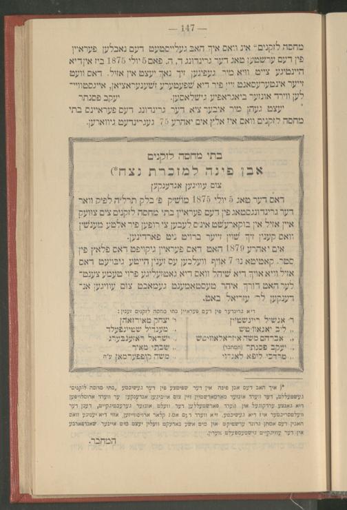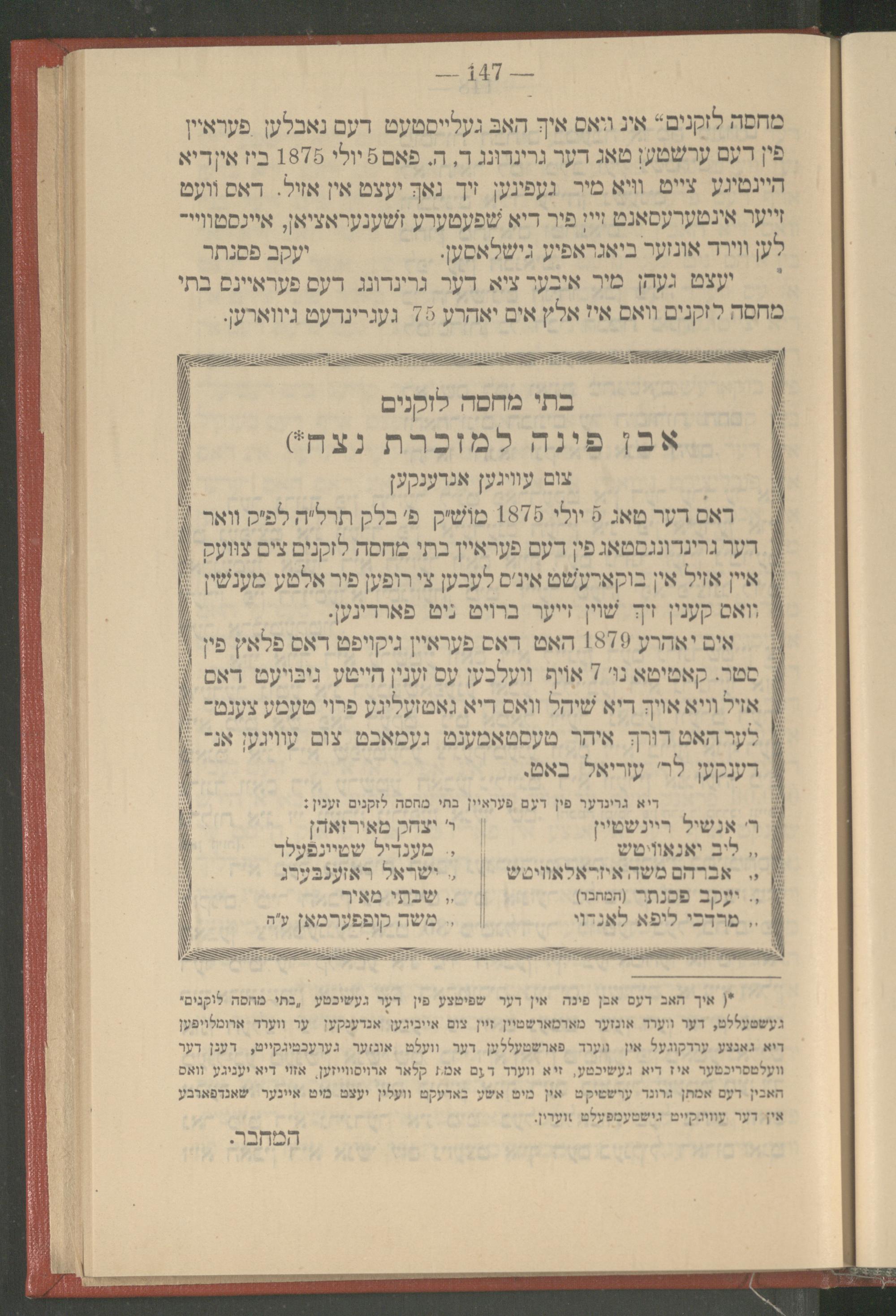 מחסה לזקנים“ אין וואס איך האב געלייסטעט דעם נאבלען פעראיין פין דעם ערשטען טאג דער גרינדונג ד, ה, פאם 5 יולי 1875 ביז אין דיא היינטיגע צייט וויא מיר געפינען זיך נאך יעצט אין אזיל. דאס וועט זייער אינטערעסאנט זיין פיר דיא שפעטערע זשענעראציאן, איינסטוויי־ לען ווירד אונזער ביאגראפיע גישלאסען. יעקב פסנתר יעצט געהן מיר איבער ציא דער גרינדונג דעס פעראיינס בתי מחסה לזקנים וואס איז אלץ אים יאהרע 75 געגרינדעט גיווארען.