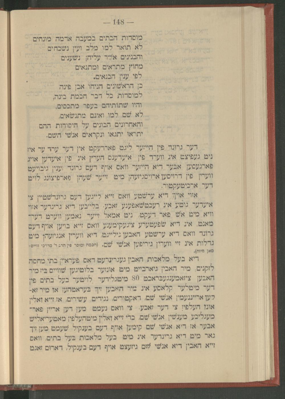 דער ארכיטעקטור. אזוי אויך דיא ערשטע וואס זייא לייגען דעם גרונדשטיין צי איעדער גוטע אין רעכטשאפענע זאכע בלייבען דיא גרינדער אזוי וויא מיט אש פאר דעקט, ניט אמאל זייער נאמען ווערט דער־ מאנט, אין דיא שפעטערע ציגעקומענע וואס זייא בויען אויף דעם גרונד וואס דיא ערשטע האבען גילייגט, דיא ווערין אנגיזעהן מיט גדלות אין זיי ווערין גיריפען אנשי שם.( חכמה ומוסר פין הרב ר' מררכי ווייס