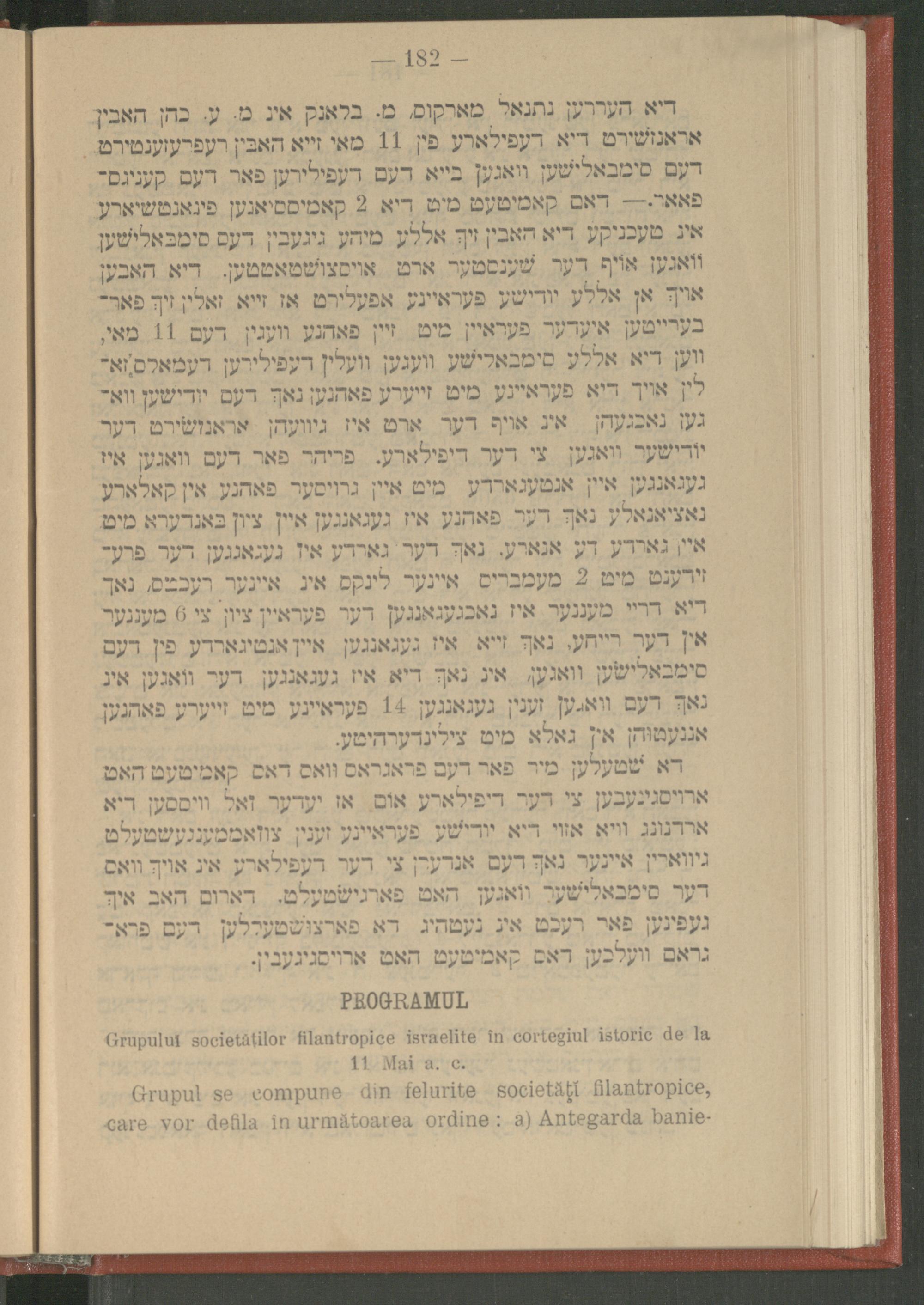 דא שטעלען מיר פאר דעם פראגראס וואס דאס קאמיטעט האט ארויסגינעבען צי דער דיפילארע אום אז יעדער זאל וויססען דיא ארדנונג וויא אזוי דיא יודישע פעראיינע זענין צוזאממענגעשטעלט גיווארין איינער נאך דעם אנדערן צי דער דעפילארע אין אויך וואס דער סימבאלישער וואגען האט פארגישטעלט, דארום האב איך געפינען פאר רעכט אין נעטהיג דא פארצושטעללען דעם פראי גראס וועלכען דאס קאמיטעט האט ארויסגיגעבין.