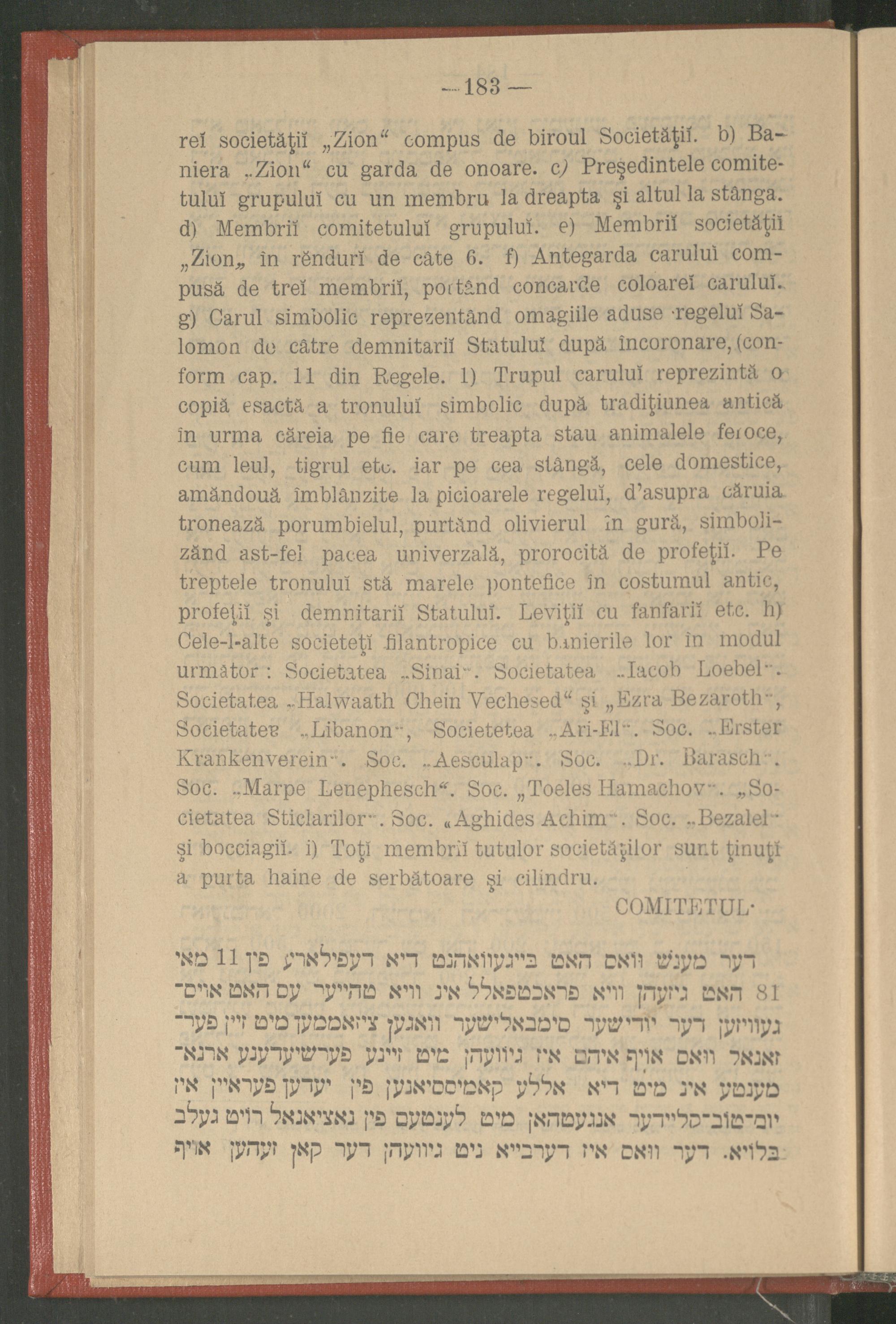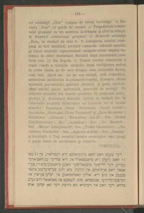 rei societăţii„ ,, Zion" compus de biroul Societăţii. b) Baniera Zion" cu garda de onoare. c) Preşedintele comitetului grupului cu un membru la dreapta şi altul la stânga. d) Membrii comitetuluĭ grupului. e) Membrii societăţii Zion ,, în rěnduri de câte 6. f) Antegarda carului compusă de trei membrii, portând concarde coloarei carului. g) Carul simbolic reprezentând omagiile aduse regeluĭ Salomon de câtre demnitarii Statului după încoronare,( conform cap. 11 din Regele. 1) Trupul carului reprezintă o copiă esactă a tronului simbolic după tradiţiunea antică în urma căreia pe fie care treapta stau animalele feroce, cum leul, tigrul etc. iar pe cea stângă, cele domestice, amǎndouă îmblânzite la picioarele regelui, d'asupra căruia tronează porumbielul, purtând olivierul în gură, simbolizănd ast- fel pacea univerzală, prorocită de profeții. Pe treptele tronului stă marele pontefice in costumul antic, profeţii şi demnitarii Statului. Leviții cu fanfari etc. h) Cele- l- alte societeți filantropice cu banierile lor în modul urmator: Societatea Sinai. Societatea Iacob Loebel". Societatea Halwaath Chein Vechesed" şi ,, Ezra Bezaroth Societater Libanon, Societetea Ari- El. Soc. Erster Krankenverein. Soc. Aesculap. Soc. Dr. Barasch. Soc. Marpe Lenephesch". Soc. ,, Toeles Hamachov.„ Societatea Sticlarilor. Soc.« Aghides Achim. Soc.„ Bezalel" şi bocciagii. i) Toţi membrii tutulor societăților sunt ţinuţi a purta haine de serbătoare şi cilindru.