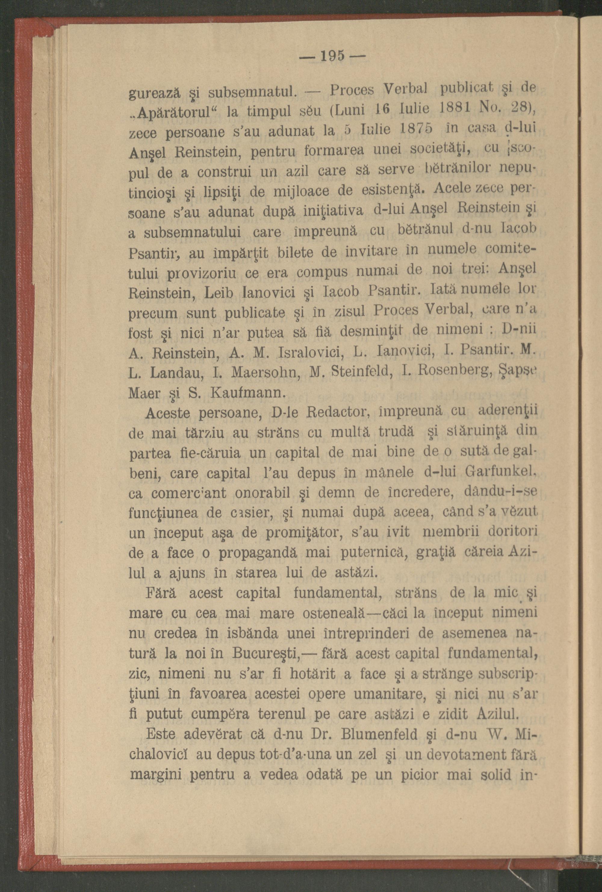 gurează şi subsemnatul. Proces Verbal publicat şi de Apărătorul" la timpul seu( Luni 16 Iulie 1881 No. 28), zece persoane s'au adunat la 5 Iulie 1875 în casa d- lui Anşel Reinstein, pentru formarea unei societăți, cu scopul de a construi un azil care să serve bětrănilor neputincioşi şi lipsiţi de mijloace de esistenţă. Acele zece persoane s'au adunat după iniţiativa d- lui Anşel Reinstein şi a subsemnatului care împreună cu bětrănul d- nu Iacob Psantir, au împărţit bilete de invitare în numele comitetului provizoriu ce era compus numai de noi trei: Anşel Reinstein, Leib lanovici şi Iacob Psantir. Iată numele lor precum sunt publicate şi în zisul Proces Verbal, care n'a fost şi nici n'ar putea să fiă desminţit de nimeni D- nii A. Reinstein, A. M. Isralovici, L. Ianovici, I. Psantir. M. L. Landau, I. Maersohn, M. Steinfeld, I. Rosenberg, Şapse Maer şi S. Kaufmann.