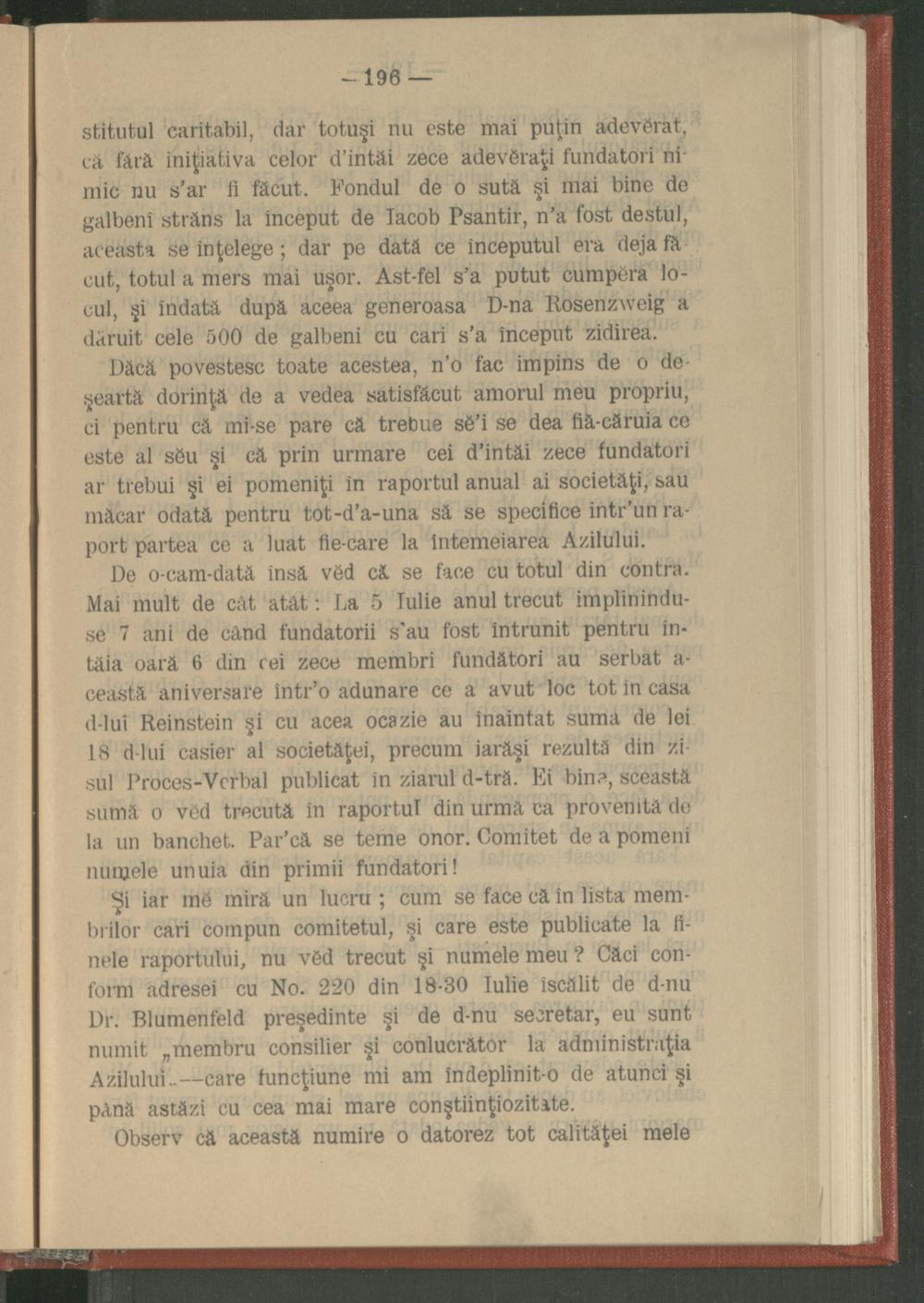 Şi iar mě miră un lucru; cum se face că în lista membrilor cari compun comitetul, şi care este publicate la finele raportului, nu věd trecut şi numele meu? Căci conform adresei cu No. 220 din 18-30 Iulie îscălit de d- nu Dr. Blumenfeld preşedinte şi de d- nu secretar, eu sunt numit„ membru consilier şi conlucrător la administraţia Azilului- care funcțiune mi am îndeplinit- o de atunci şi până astăzi cu cea mai mare conştiinţiozitate.