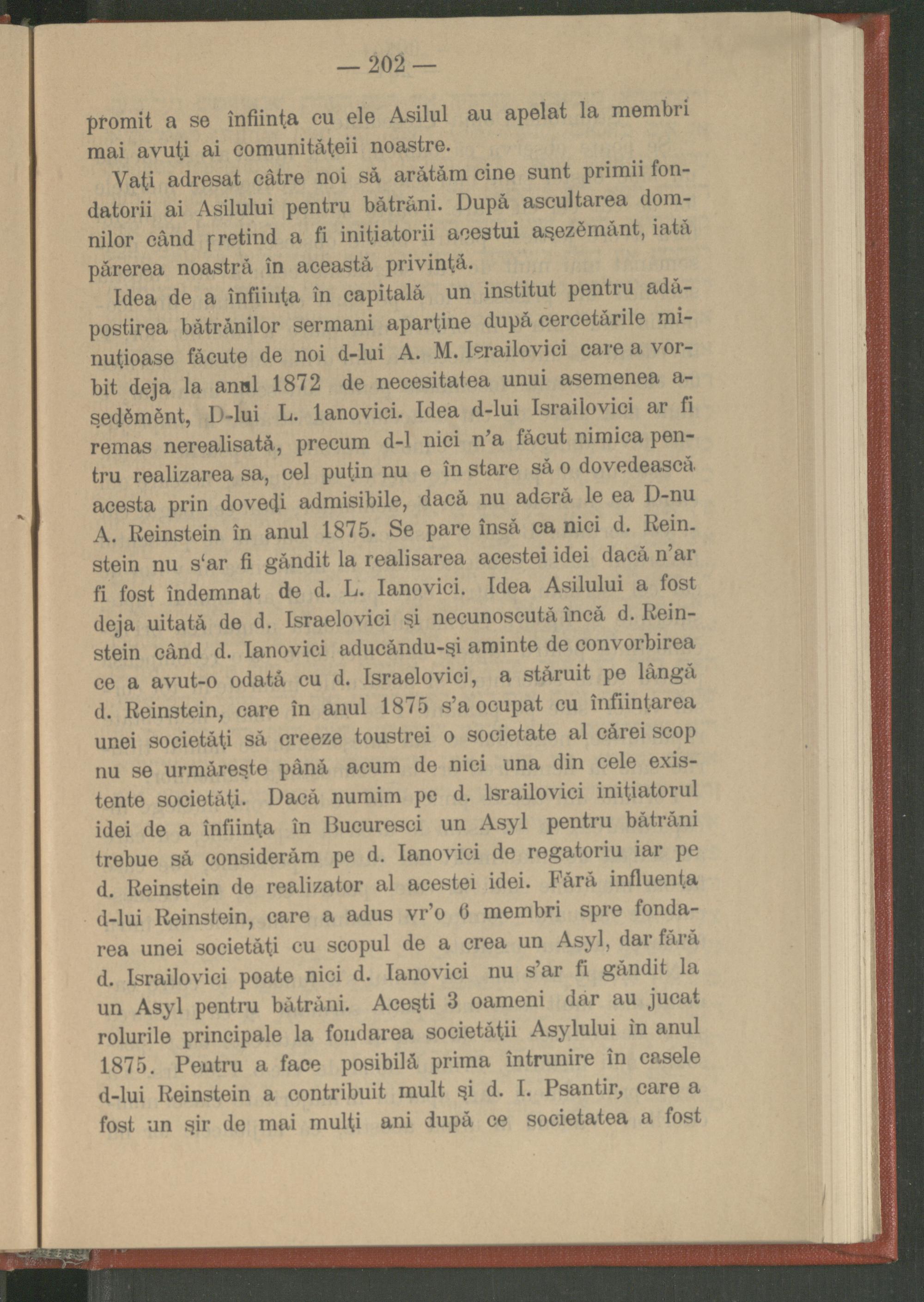 Idea de a înființa în capitală un institut pentru adǎpostirea bătrănilor sermani aparține după cercetările minuțioase făcute de noi d- lui A. M. Ierailovici care a vorbit deja la anul 1872 de necesitatea unui asemenea a- seděměnt, D- lui L. 1anovici. Idea d- lui Israilovici ar fi remas nerealisată, precum d- l nici n'a făcut nimica pentru realizarea sa, cel puțin nu e în stare să o dovedească. acesta prin dovedi admisibile, dacă nu adoră le ea D- nu A. Reinstein în anul 1875. Se pare însă ca nici d. Rein. stein nu s'ar fi găndit la realisarea acestei idei dacă n'ar fi fost îndemnat de d. L. Ianovici. Idea Asilului a fost deja uitată de d. Israelovici şi necunoscută încă d. Reinstein când d. Ianovici aducându- şi aminte de convorbirea ce a avut- o odată cu d. Israelovici, a stăruit pe lângă d. Reinstein, care în anul 1875 s'a ocupat cu înfiinţarea unei societăți să creeze toustrei o societate al cărei scop nu se urmăreşte până acum de nici una din cele existente societăți. Dacă numim pe d. Israilovici inițiatorul idei de a înființa în Bucuresci un Asyl pentru bătrăni trebue să considerăm pe d. Ianovici de regatoriu iar pe d. Reinstein de realizator al acestei idei. Fără influenţa d- lui Reinstein, care a adus vr'o 6 membri spre fondarea unei societăți cu scopul de a crea un Asyl, dar fără d. Israilovici poate nici d. Ianovici nu s'ar fi găndit la un Asyl pentru bătrăni. Aceşti 3 oameni dar au jucat rolurile principale la fondarea societății Asylului în anul 1875. Pentru a face posibilă prima întrunire în casele d- lui Reinstein a contribuit mult şi d. I. Psantir, care a fost un şir de mai mulţi ani după ce societatea a fost