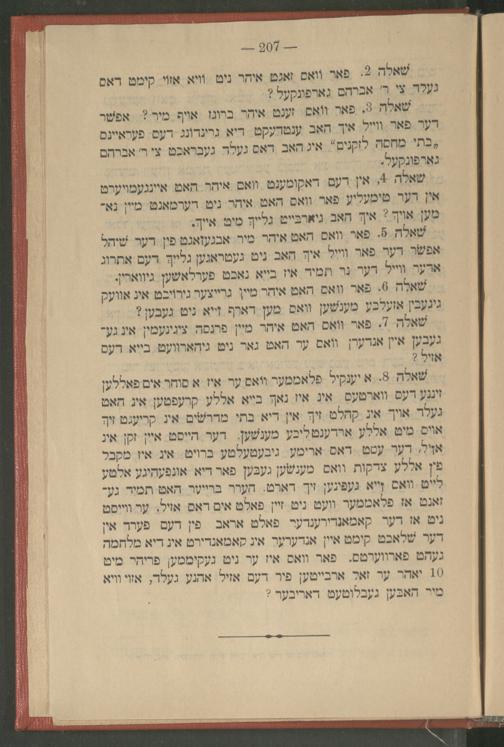 שאלה 8. א יענקיל פלאממער וואס ער איז א סוחר אים פאללען זיננע דעס ווארטעס אין איז נאך בייא אללע קרעפטען אין האט געלד אויך אין קהלט זיך אין דיא בתי מדרשים אין קריעגט זיך אויס מיט אללע ארדענטליכע מענשען, דער הייסט איין זקן אין אױ'ל, דער עסט דאס ארימע גיבעטעלטע ברויט אין אין מקבל פין אללע צדקות וואס מענשען געבען פאר דיא אונפעהיגע אלטע לייט וואס זייא געפינען זיך דארט. הערר ברייער האט תמיד גע־ זאנט אז פלאממער וועט ניט זיין פאלט אים דאס אזיל, ער ווייסט ניט אז דער קאמאנדירענדער פאלט אראב פין דעם פערד אין דער שלאכט קימט איין אנדערער אין קאמאנדירט אין דיא מלחמה געהט פארווערטס. פאר וואס איז ער ניט געקיממען פריהר מיט 10 יאהר ער זאל ארבייטען פיר דעם אזיל אהנע געלד, אזוי וויא מיר האבען געבלוטעט דאריבער?