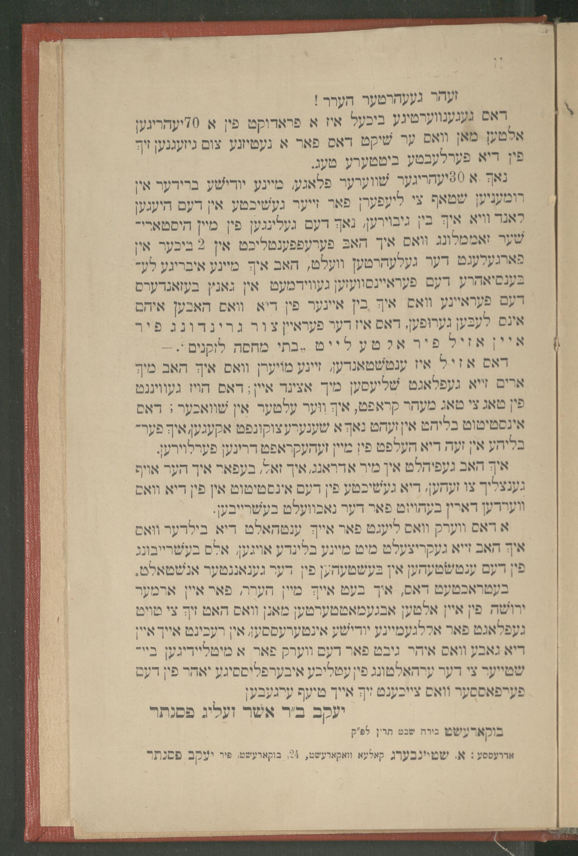 בוקארעשט בירח שבט תרין לפ"ק אדרעססע: א. שטיינבערג קאלעא וואקארעשט, 24, בוקארעשט, פיר יעקב פסנתר