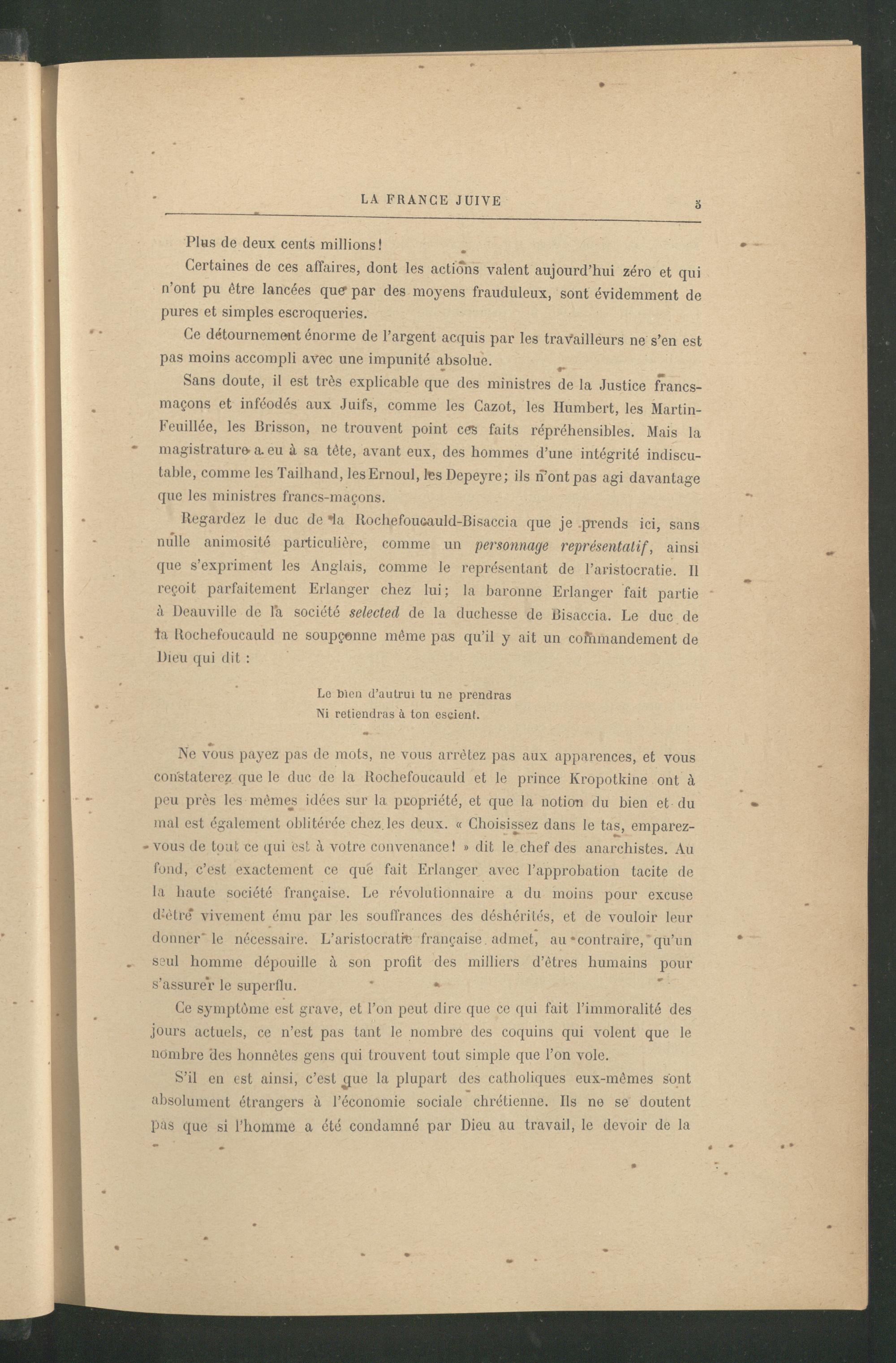 Regardez le duc de *ia Itochefouûauld-Bisaccia que je .prends ici, sans nulle animosité particulière, comme un personnage représentatif, ainsi que s’expriment les Anglais , comme le représentant de l’aristocratie. Il reçoit parfaitement Erlanger chez lui; la baronne Erlanger fait partie à Deauville de la société selected de la duchesse de Bisaccia. Le duc de ta Rochefoucauld ne soupçonne même pas qu’il y ait un coîhmandement de Dieu qui dit :