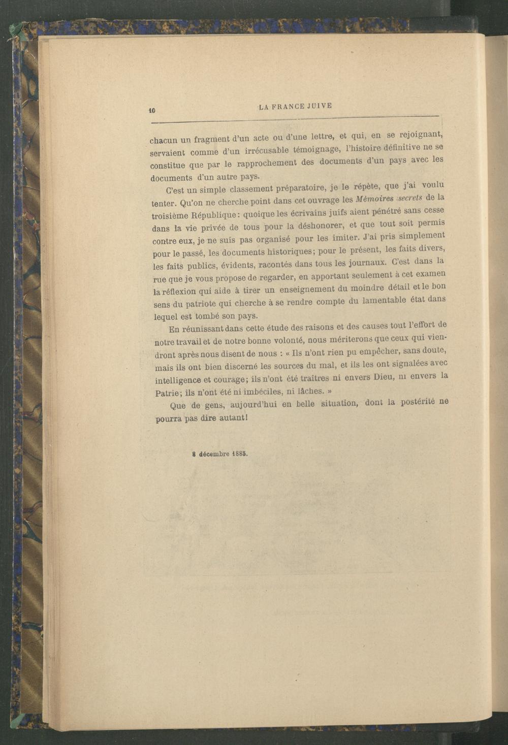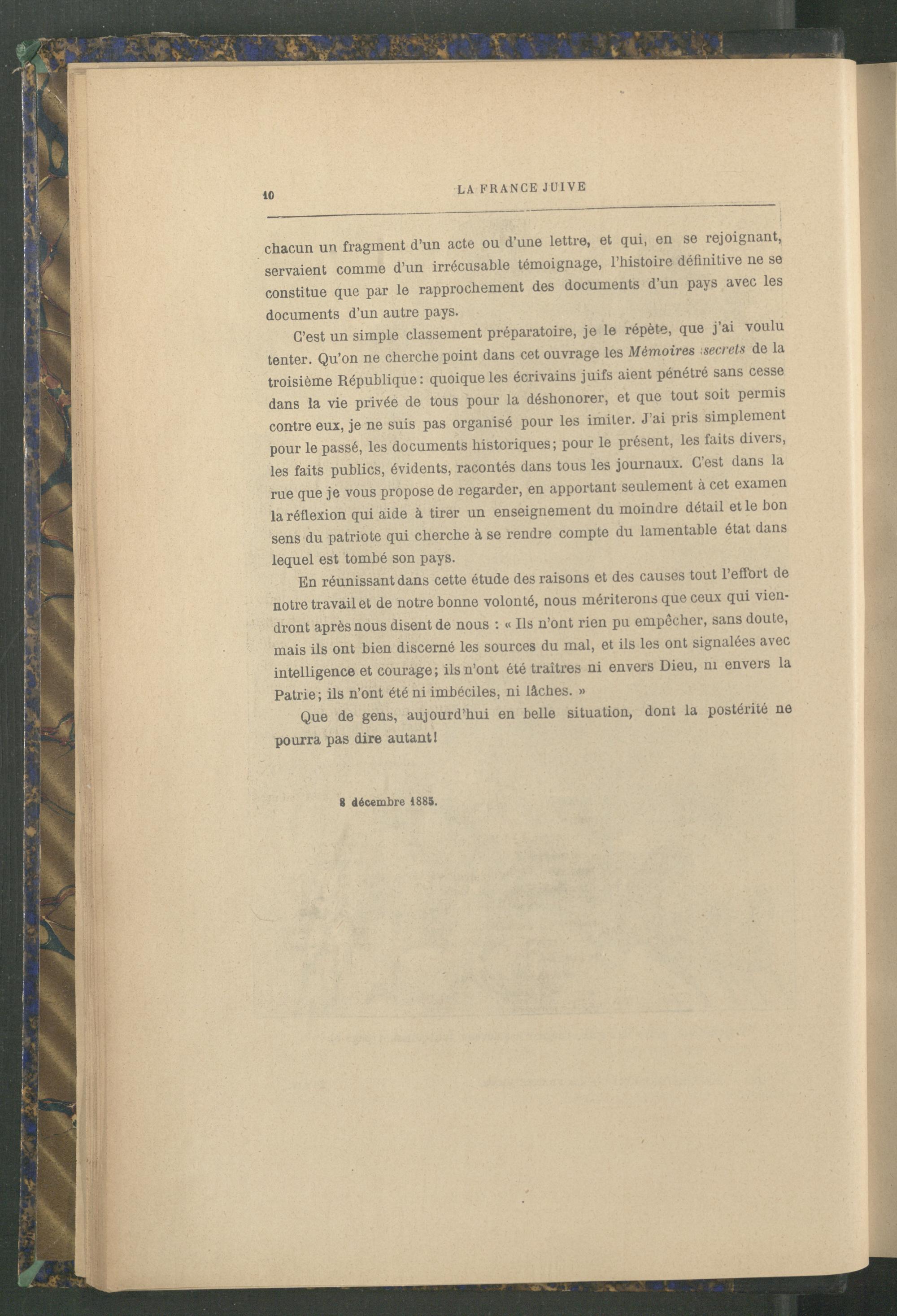 C’est un simple classement préparatoire, je le répète, que j’ai voulu tenter. Qu’on ne cherche point dans cet ouvrage les Mémoires secrets de la troisième République: quoique les écrivains juifs aient pénétré sans cesse dans la vie privée de tous pour la déshonorer, et que tout soit permis contre eux, je ne suis pas organisé pour les imiter. J’ai pris simplement pour le passé, les documents historiques; pour le présent, les faits divers, les faits publics, évidents, racontés dans tous les journaux. C’est dans la rue que je vous propose de regarder, en apportant seulement à cet examen la réflexion qui aide à tirer un enseignement du moindre détail et le bon sens du patriote qui cherche à se rendre compte du lamentable état dans lequel est tombé son pays.