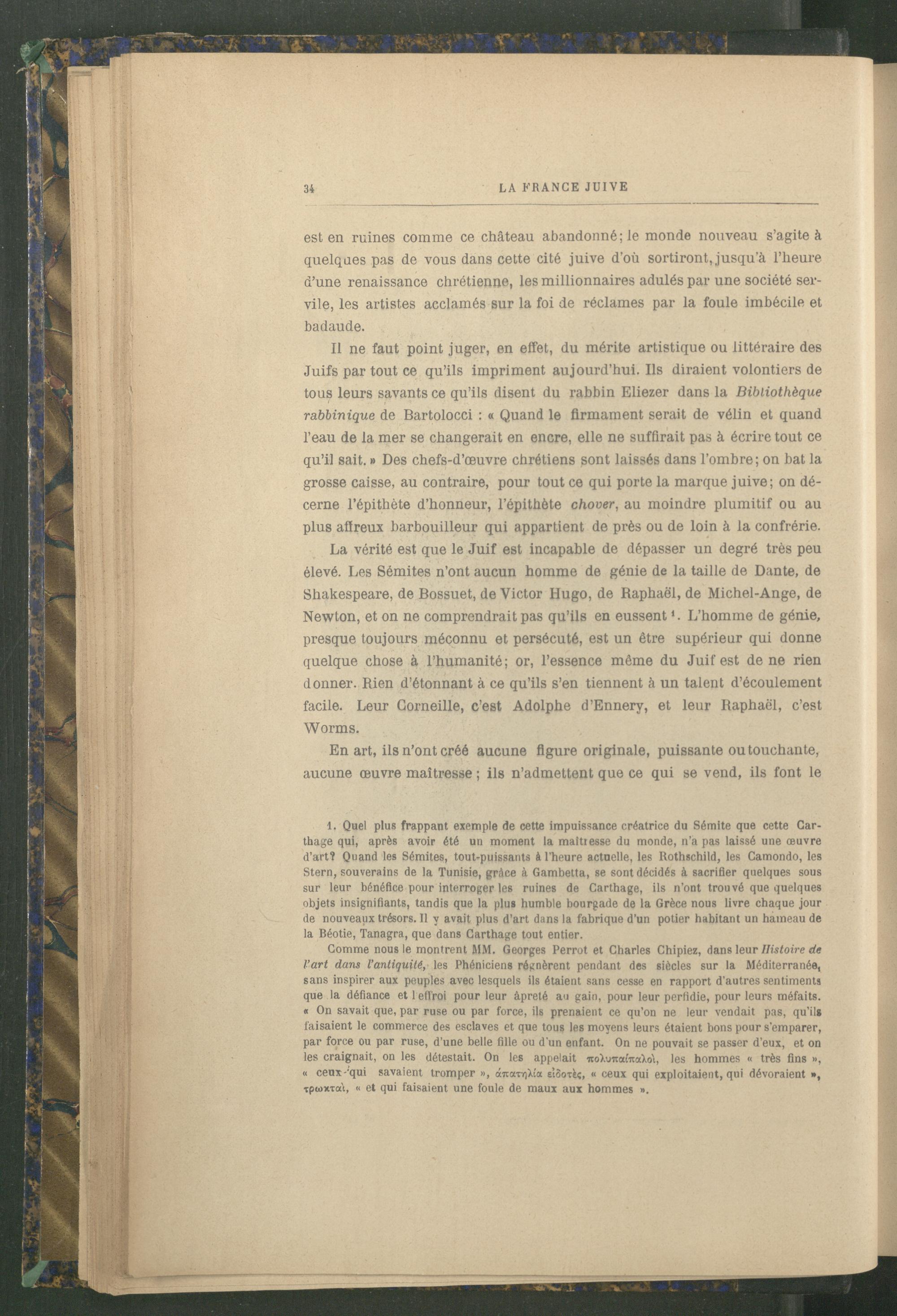 1. Quel plus frappant exemple de cette impuissance créatrice du Sémite que cette Carthage qui, après avoir été un moment la maltresse du monde, n’a pas laissé une œuvre d’artî Quand les Sémites, tout-puissants à l’heure actuelle, les Rothschild , les Camondo, les Stern, souverains de la Tunisie , grâce à Gambetta, se sont décidés à sacrifier quelques sous sur leur bénéfice pour interroger les ruines de Carthage, ils n’ont trouvé que quelques objets insignifiants, tandis que la plu» humble bourgade de la Grèce nous livre chaque jour de nouveaux trésors. Il y avait plus d'art dans la fabrique d'un potier habitant un hameau de la Béotie, Tanagra , que dans Carthage tout entier.