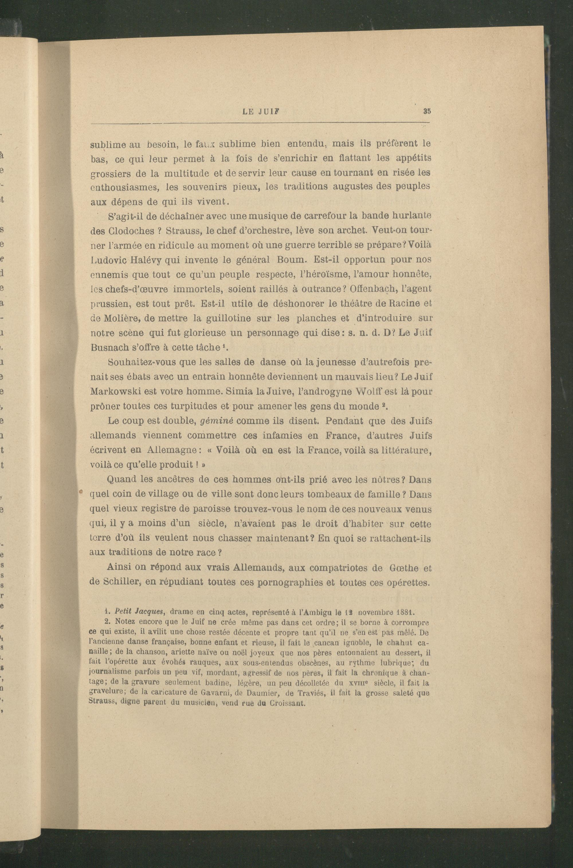 S’agit-il de déchaîner avec une musique de carrefour la bande hurlante des Glodoches ? Strauss, le chef d’orchestre, lève son archet. Veut-on tourner l’armée en ridicule au moment où une guerre terrible se prépare? Voilà Ludovic Halévy qui invente le général Boum. Est-il opportun pour nos ennemis que tout ce qu’un peuple respecte, l’héroïsme, l’amour honnête, les chefs-d’œuvre immortels, soient raillés à outrance? Oflenbach, l’agent prussien, est tout prêt. Est-il utile de déshonorer le théâtre deftacine et de Molière , de mettre la guillotine sur les planches et d’introduire sur notre scène qui fut glorieuse un personnage qui dise: s. n. d. D? Le Juif Busnach s’offre à cette tâche b