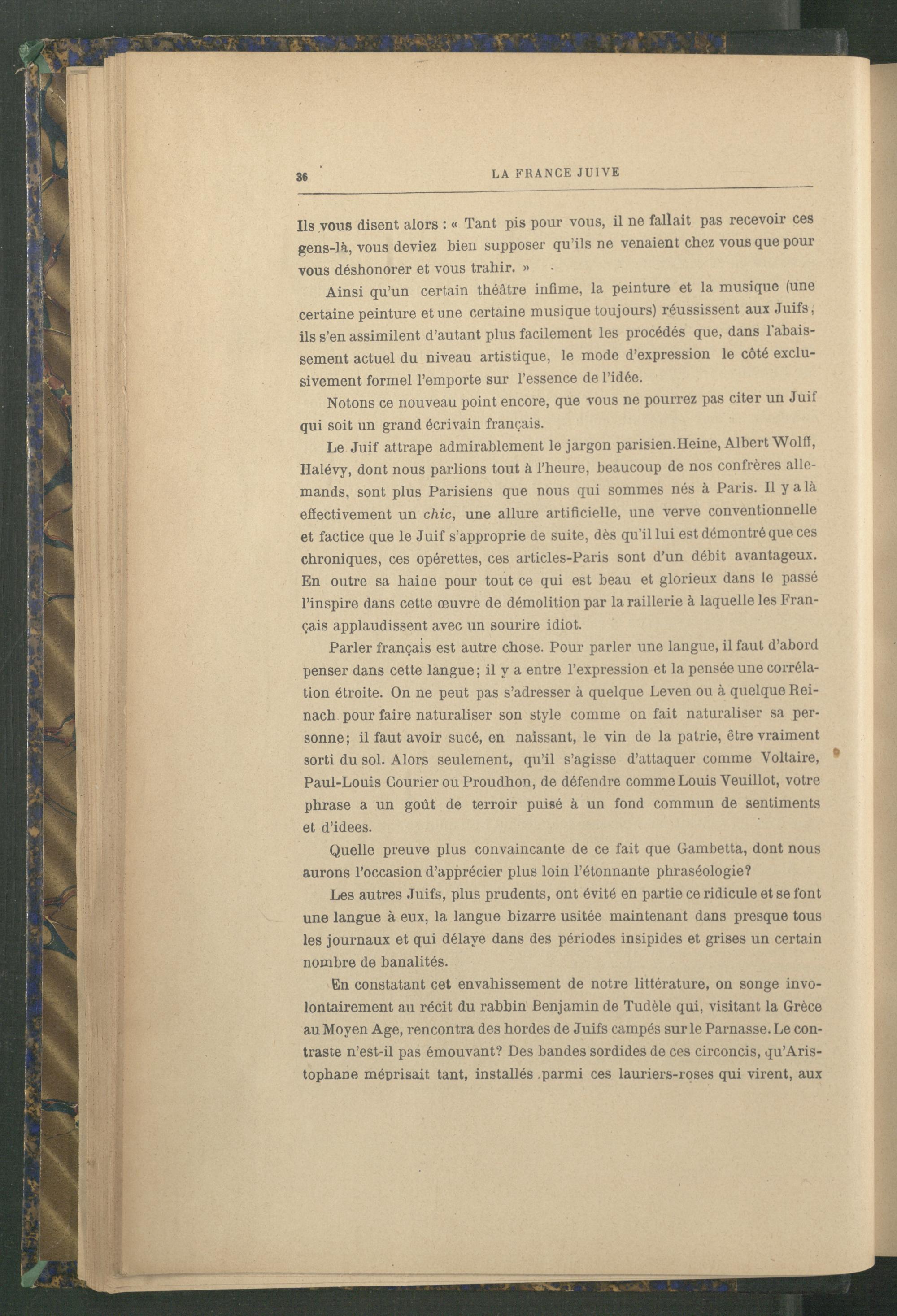 Le Juif attrape admirablement le jargon parisien.Heine, Albert Wolfl, Halévy, dont nous parlions tout à l’heure, beaucoup de nos confrères alle mands , sont plus Parisiens que nous qui sommes nés à Paris . Il y a là effectivement un chic, une allure artificielle, une verve conventionnelle et factice que le Juif s’approprie de suite, dès qu’il lui est démontré que ces chroniques, ces opérettes, ces articles-Paris sont d’un débit avantageux. En outre sa haine pour tout ce qui est beau et glorieux dans le passé l’inspire dans cette œuvre de démolition par la raillerie à laquelle les Fran çais applaudissent avec un sourire idiot.
