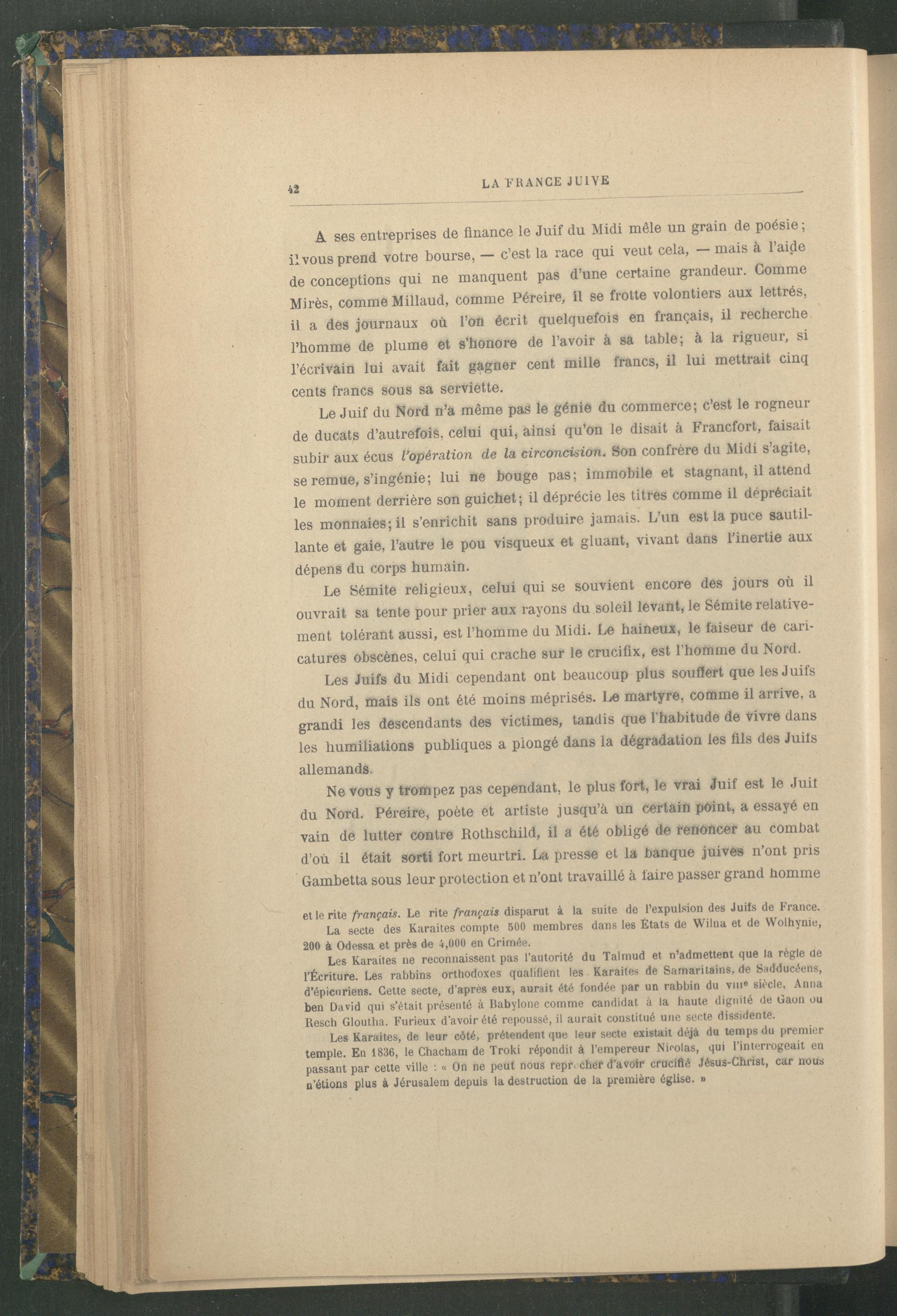 Ne vous y trompez pas cependant, le plus fort, le vrai Juif est le Juit du Nord. Péreire, poète et artiste jusqu’à un certain point, a essayé en vain de lutter contre Rothschild , il a été obligé de renoncer au combat d’où il était sorti fort meurtri. La presse et la banque juives n’ont pris Gambetta sous leur protection et n’ont travaillé à faire passer grand nomme